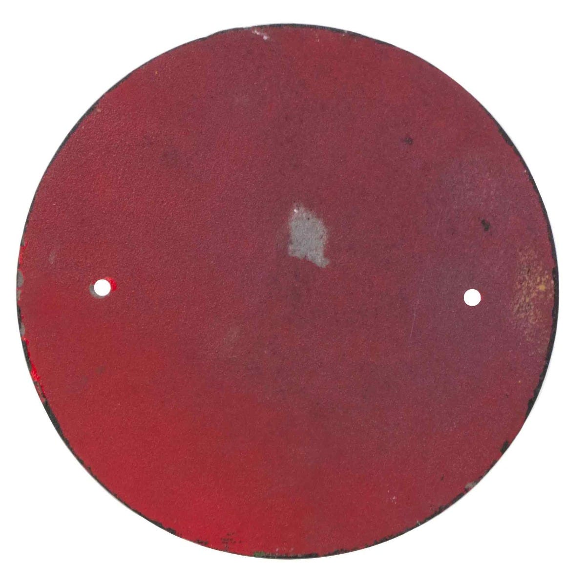 Manufactured in cast iron and hand painted in red, white and black. The sign has an aged, vintage finish.