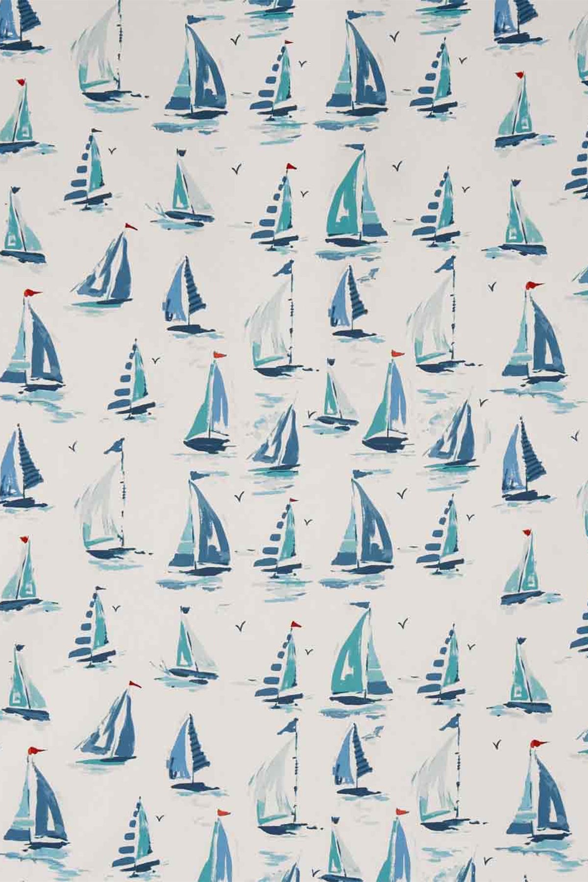 St Ives features a charming nautical print of hand-painted sailboats drifting across a soft background. The boats are illustrated in a relaxed, watercolour style, with sails in cool blue, soft grey, charcoal, and crisp white. Gentle brushstrokes suggest rippling water beneath each vessel, while tiny birds scattered throughout add to the breezy coastal feel.