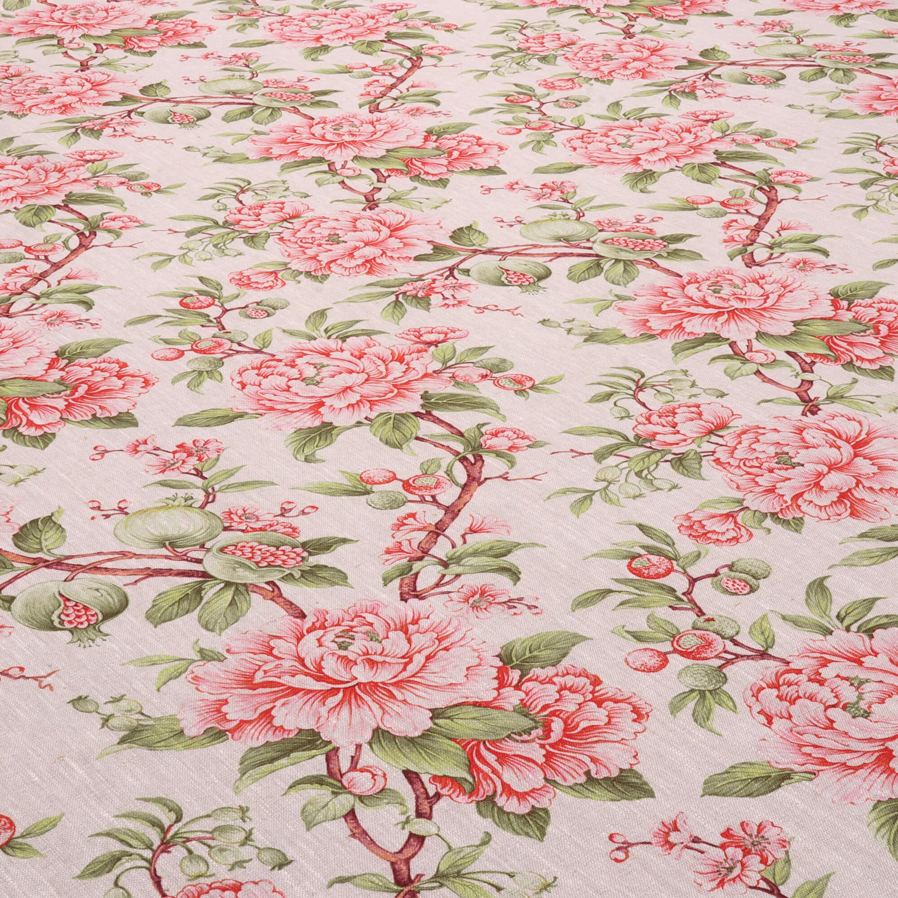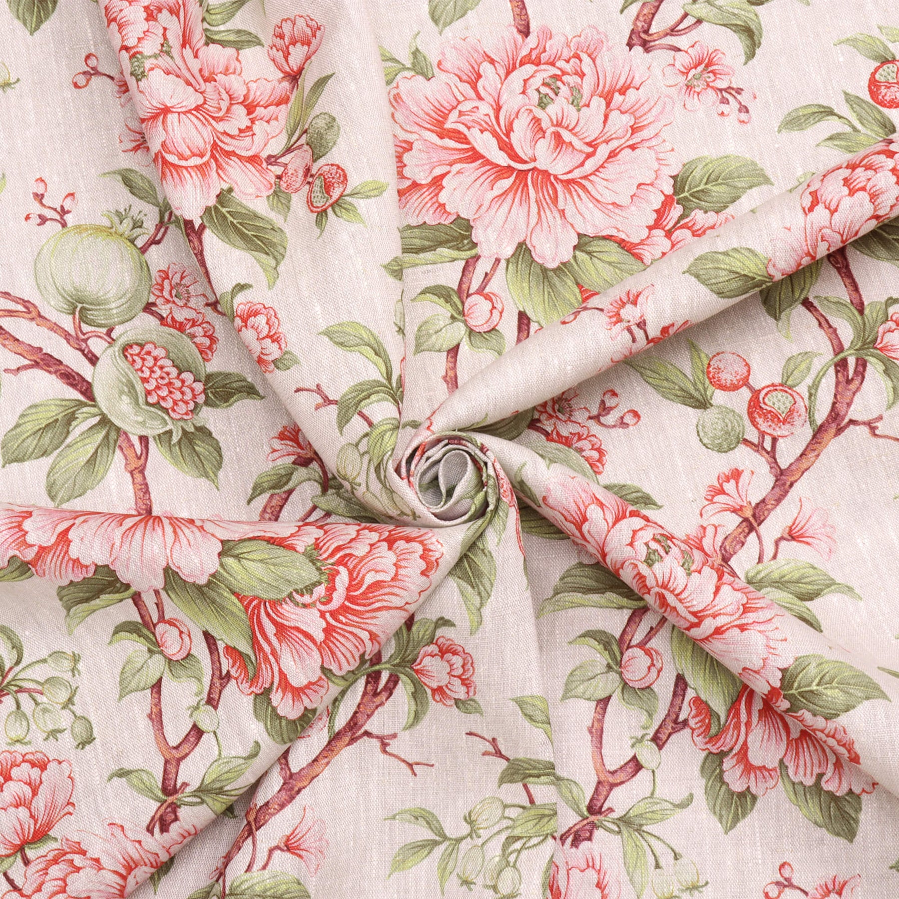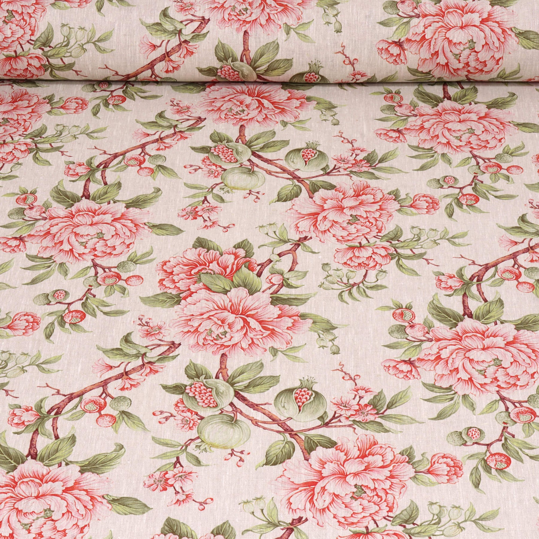 Featuring floral printed on 100% linen, Esme showcases an elegant botanical design with large blush-pink peony blooms, delicate buds, and leafy green branches scattered across a soft natural linen background. Accents of muted red and olive tones add depth and a vintage garden feel, creating a timeless all-over print that’s perfect for curtains, blinds and soft furnishings.