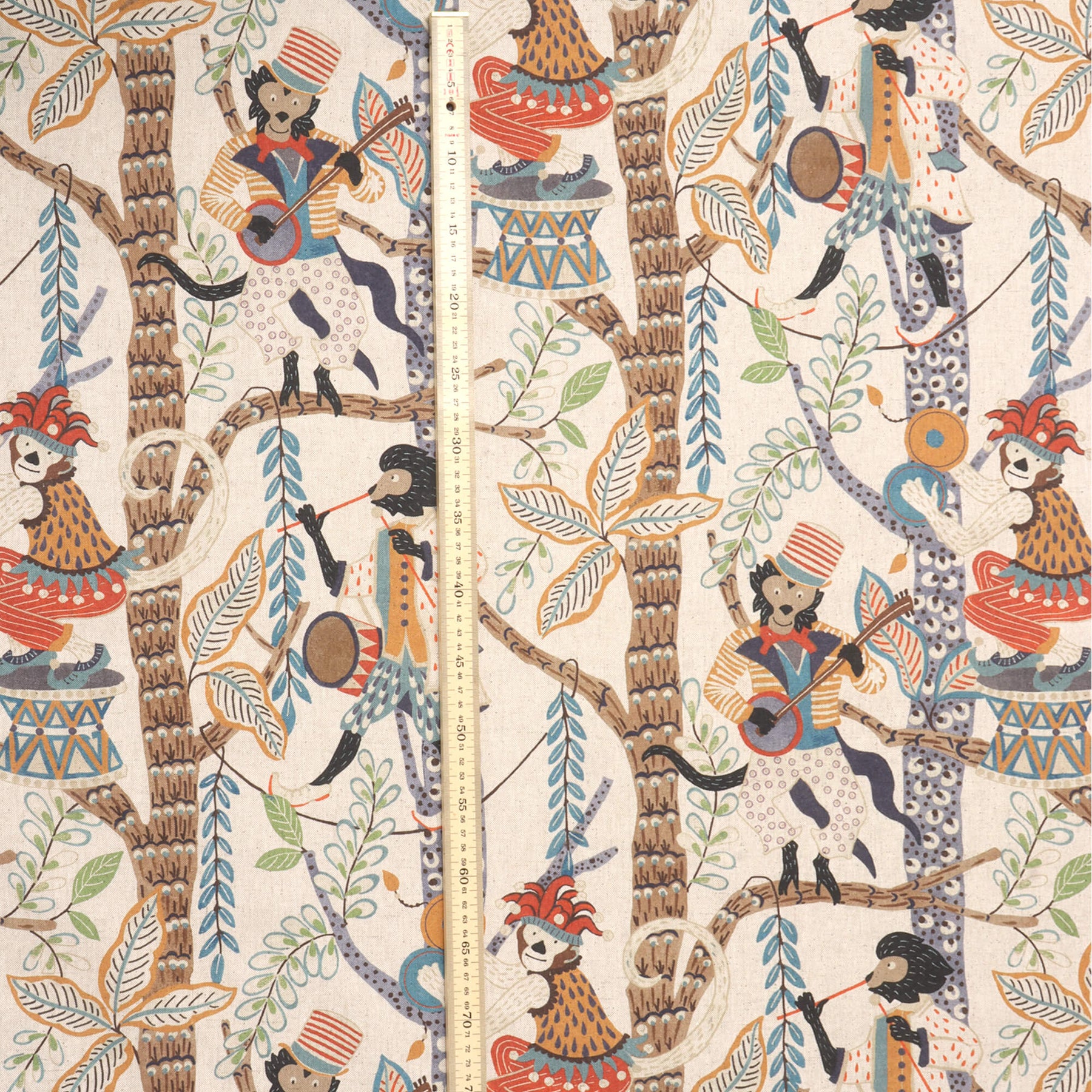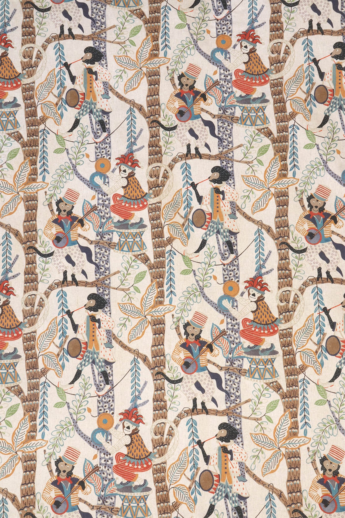 Monkey Carnival Double Width Fabric — a lively design featuring charming musical monkeys dressed in colourful costumes, set among leafy branches and decorative details.