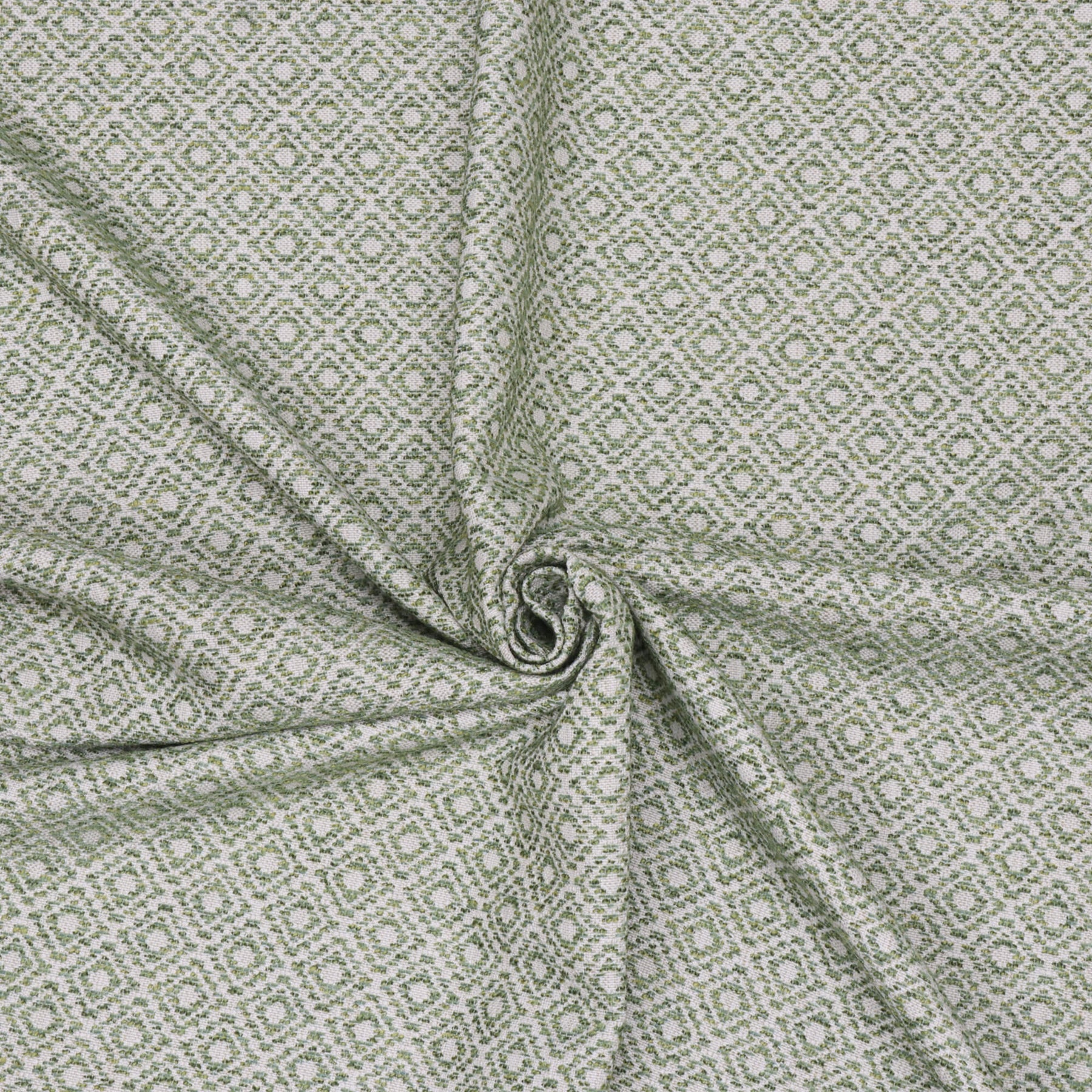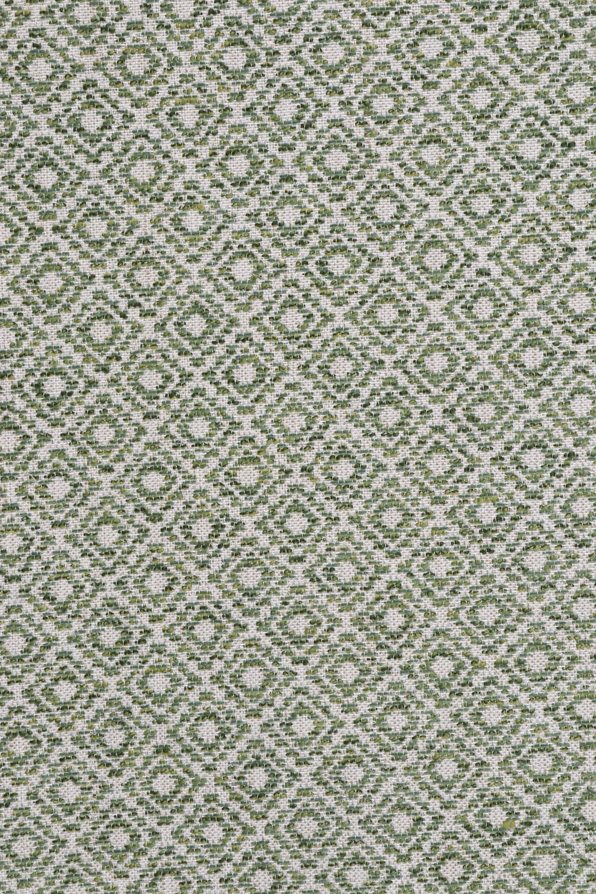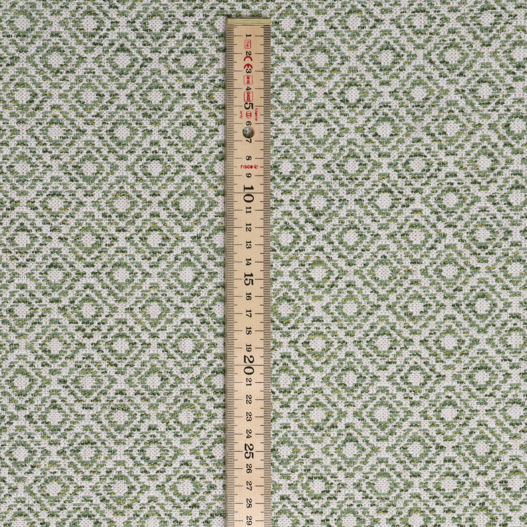 Prestigious Textiles Amir Oasis is a stylish patterned upholstery fabric featuring a delicate geometric design woven in soft green tones against a natural backdrop. The repeating motif creates a subtle yet decorative texture, making it an excellent choice for both modern and traditional interiors.
