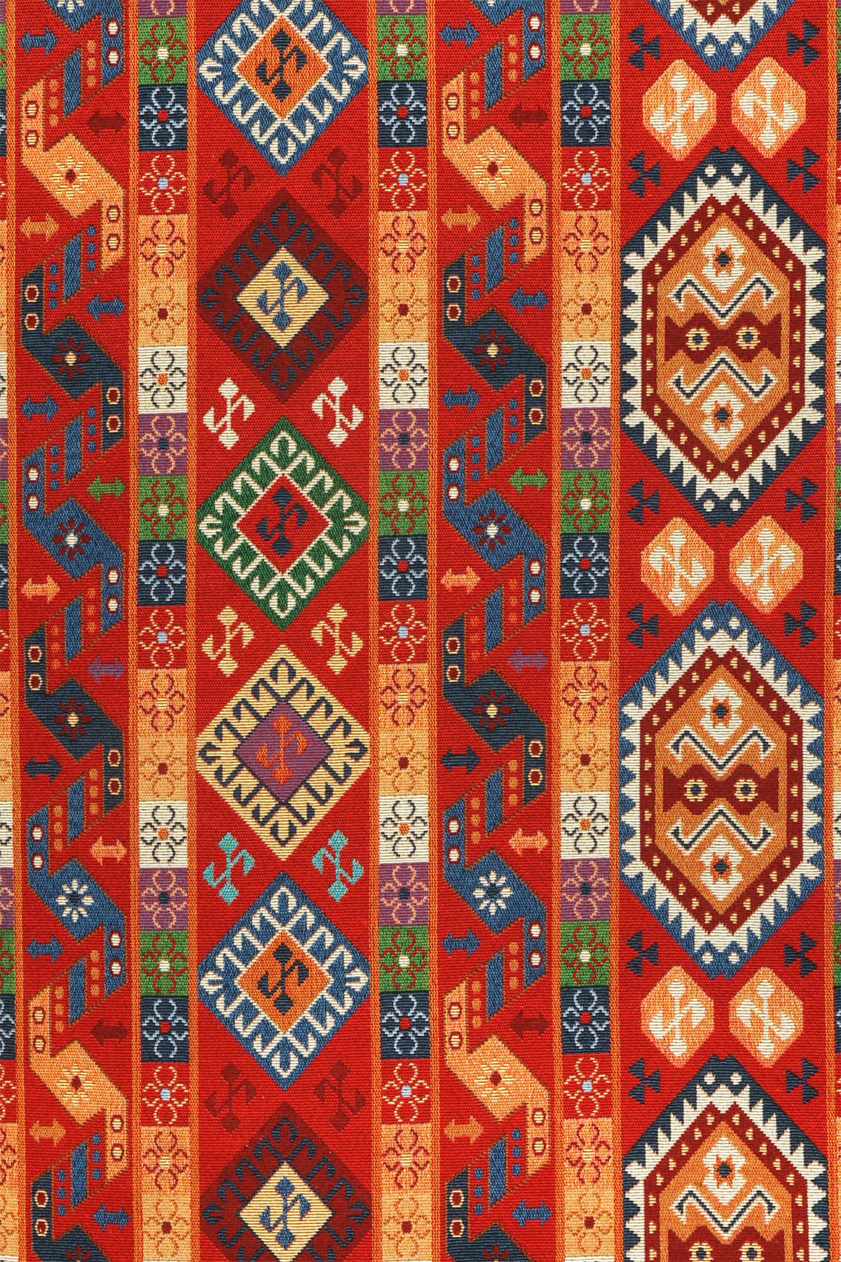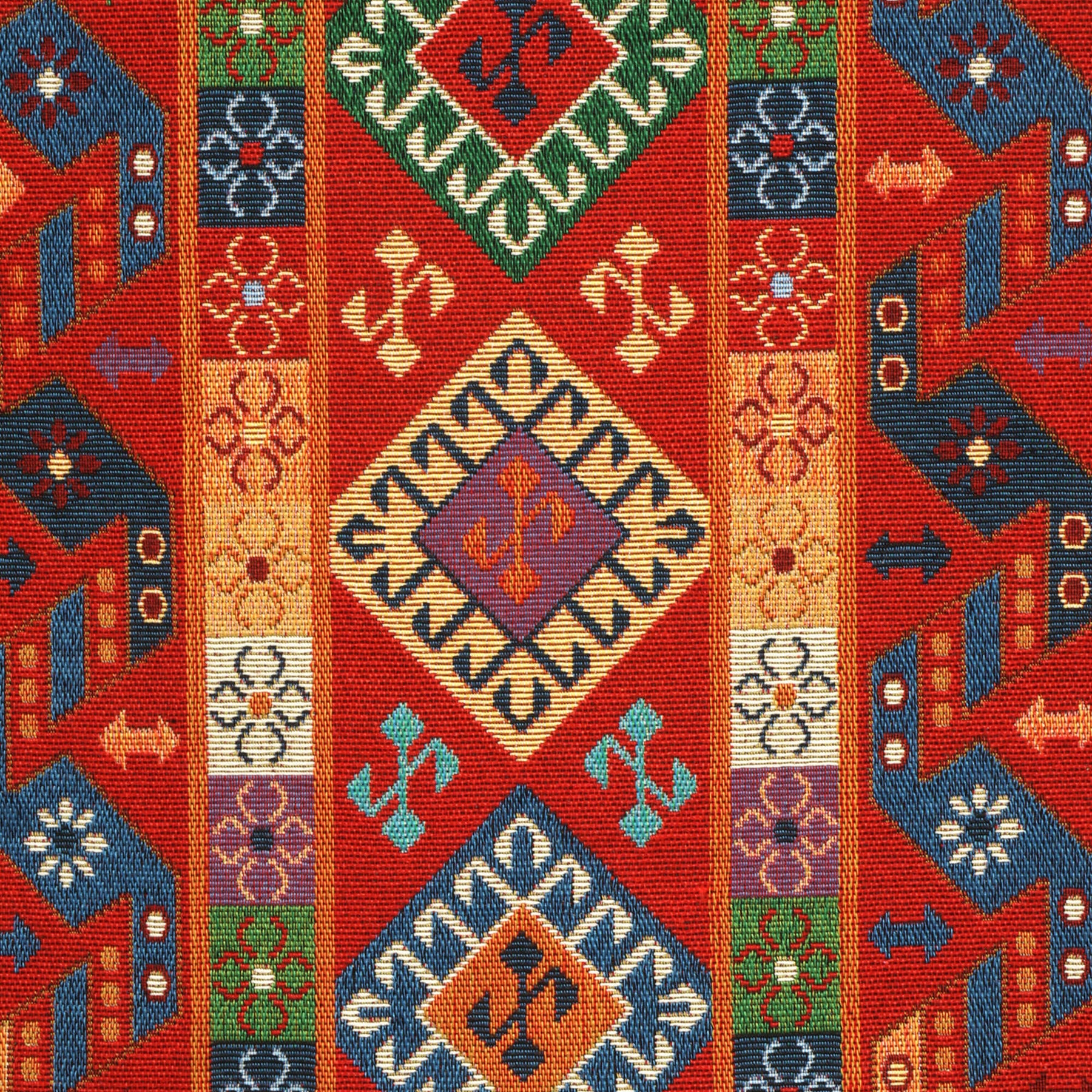 Quito Tapestry Red Fabric is a striking Kazak-inspired tapestry design featuring intricate, Middle Eastern–influenced geometric motifs woven in a rich red and blue colourway. Bold diamond medallions and angular tribal detailing are layered with ochre, cream, green and deep navy accents, creating a vibrant, rhythmic pattern with strong visual impact.