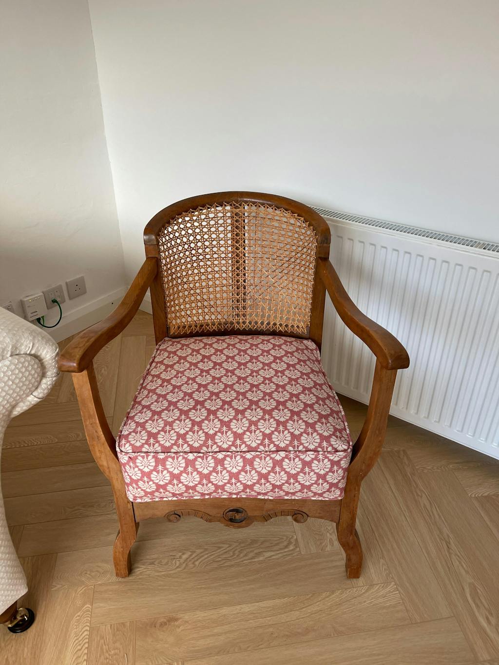 This fabric features a charming, repeating floral motif in a soft, raspberry-red background. The flowers are stylized and symmetrical, creating a classic, almost vintage look, with a simple yet elegant pattern. The colour palette gives it a cosy, countryside feel, reminiscent of traditional English interiors.