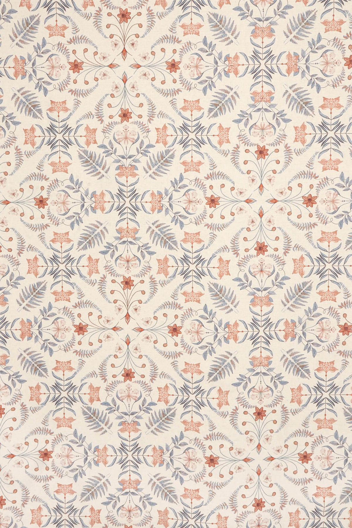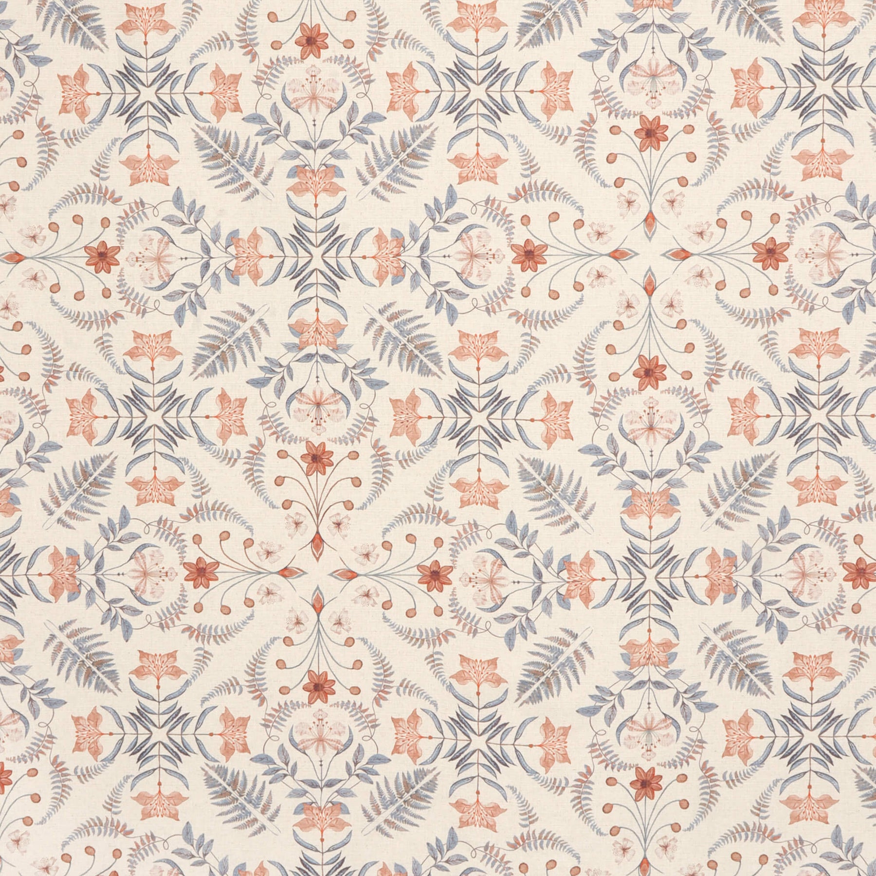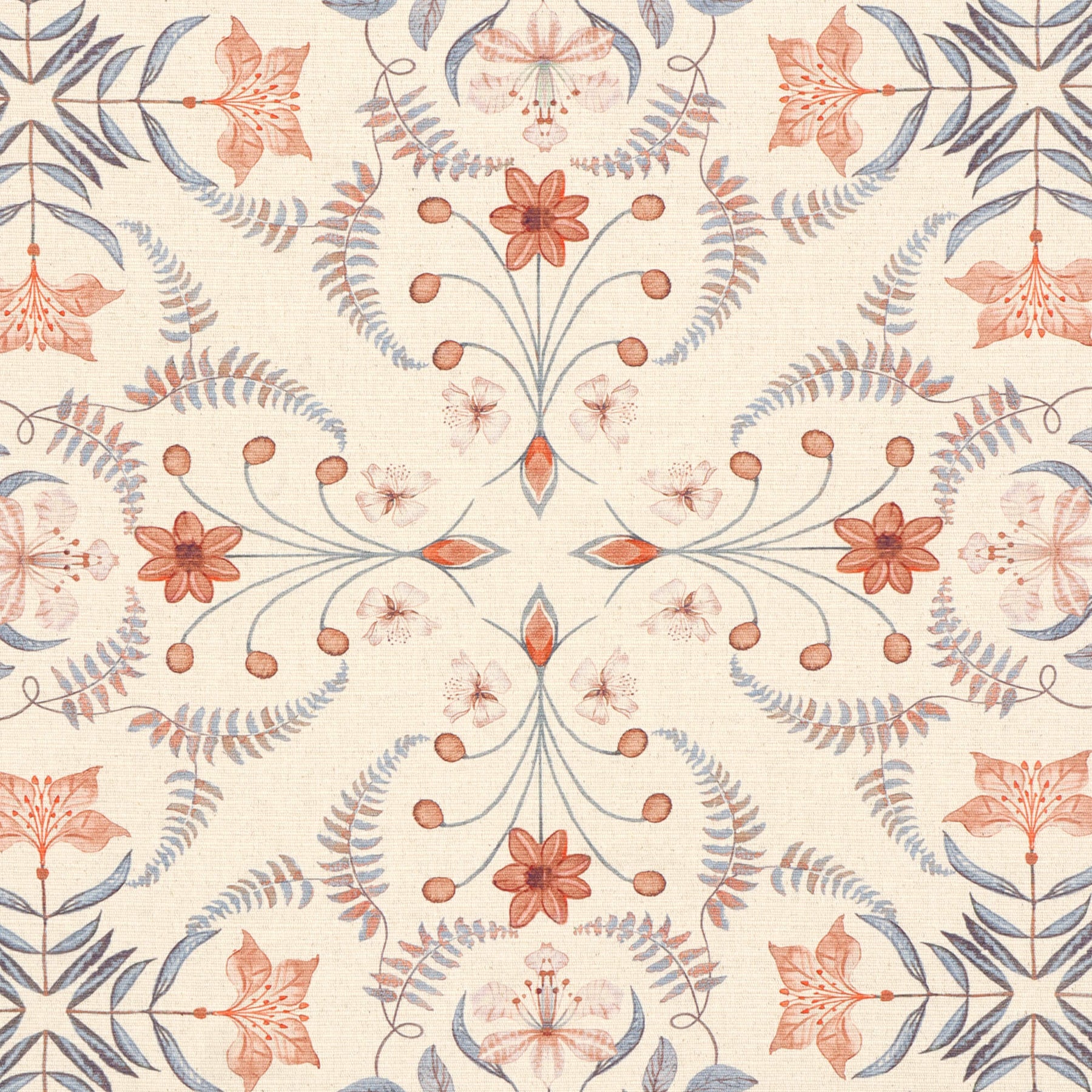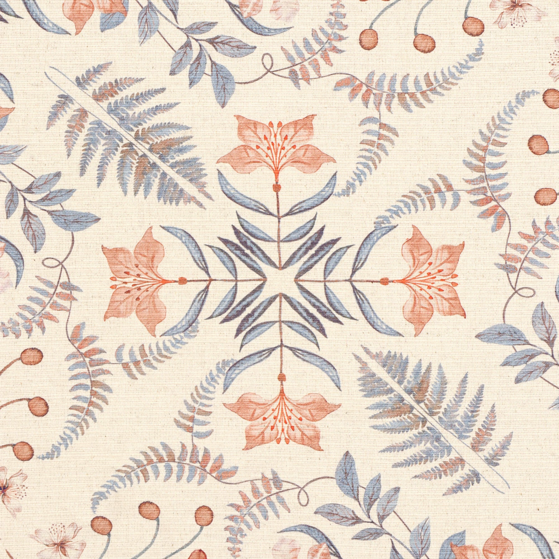 Fresco Denim is a striking symmetrical floral design printed on a natural blend of 90% cotton and 10% linen. The Denim colourway combines rich denim blue tones with soft reds, creating a warm and inviting look that works beautifully in both traditional and contemporary interiors.
