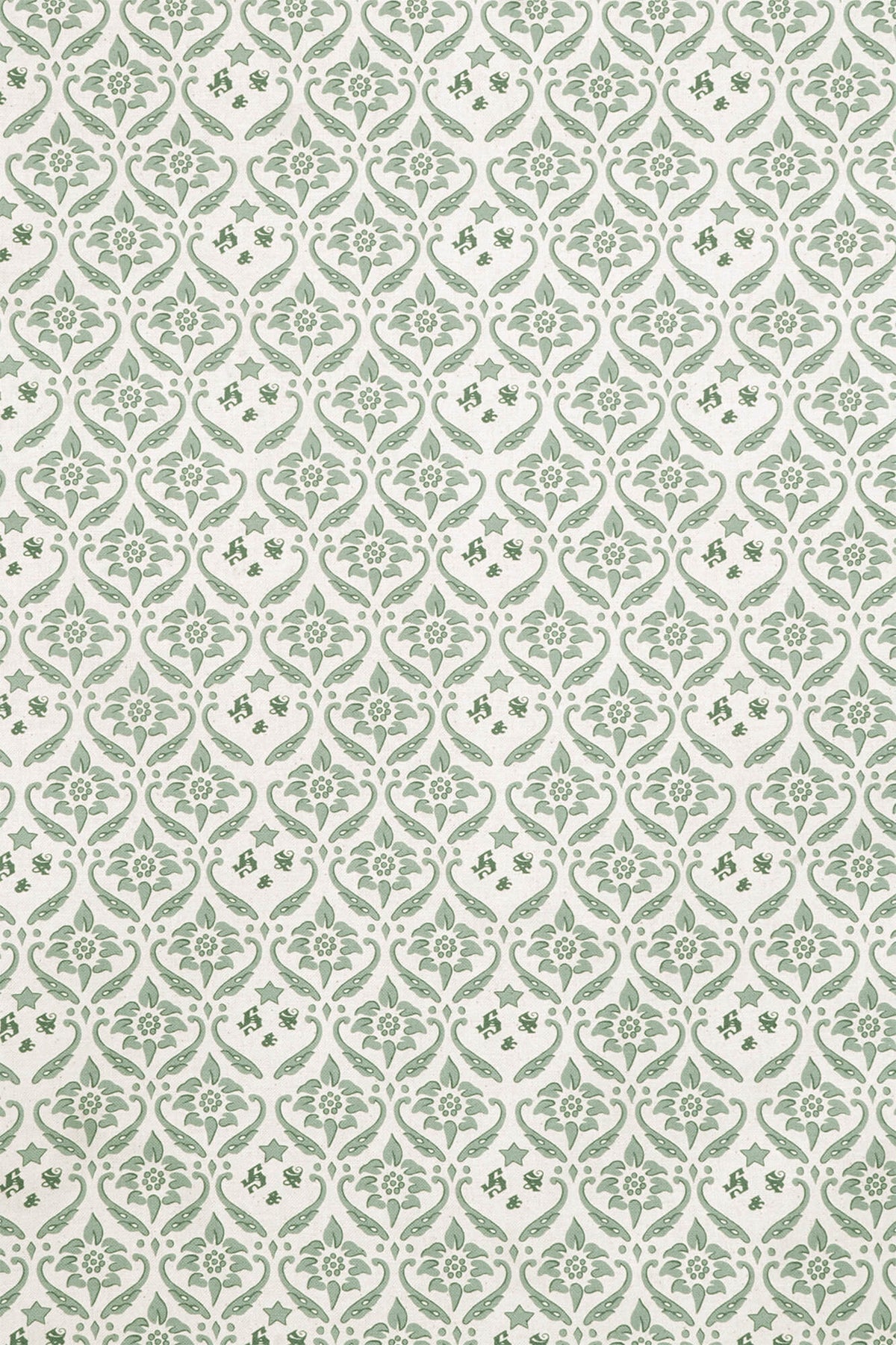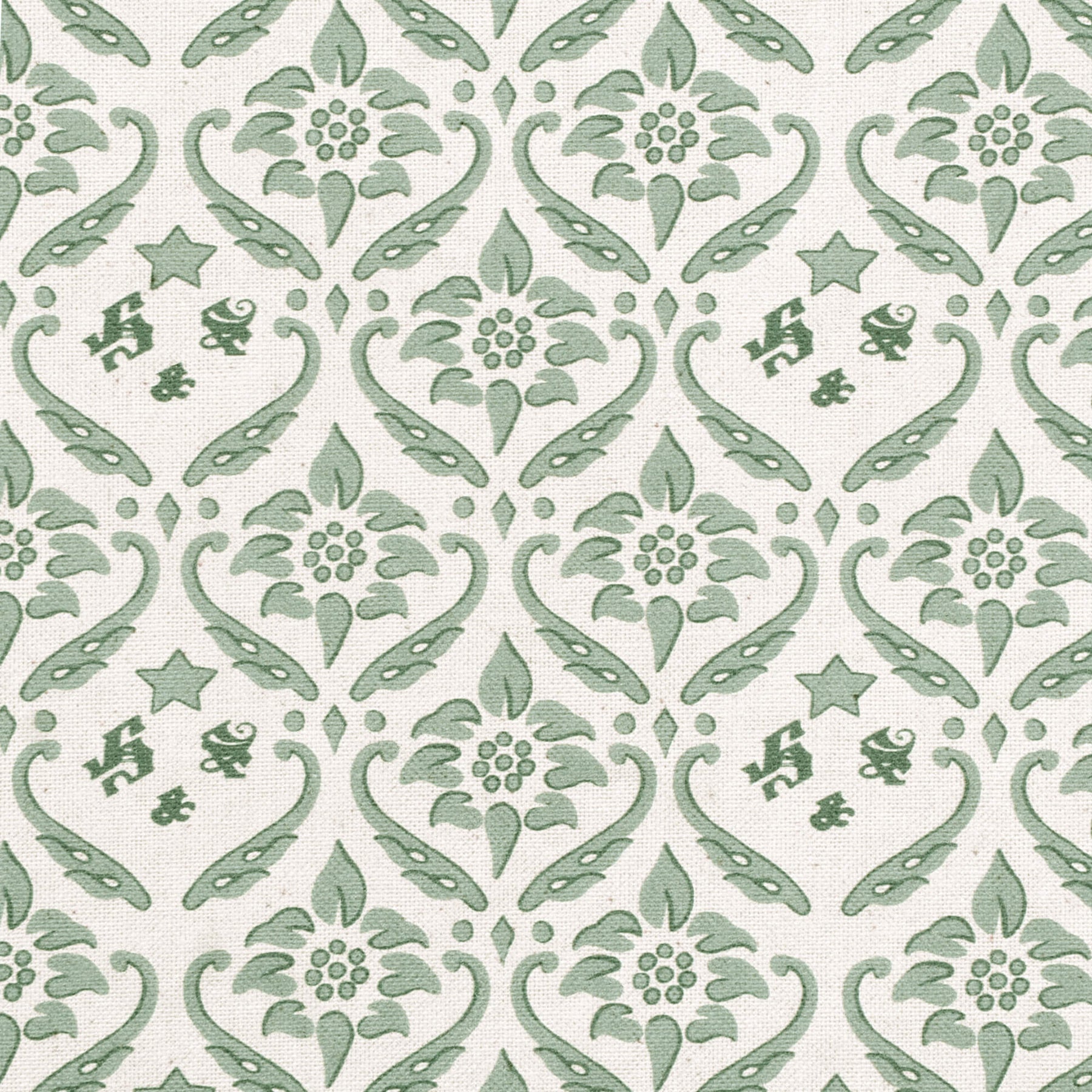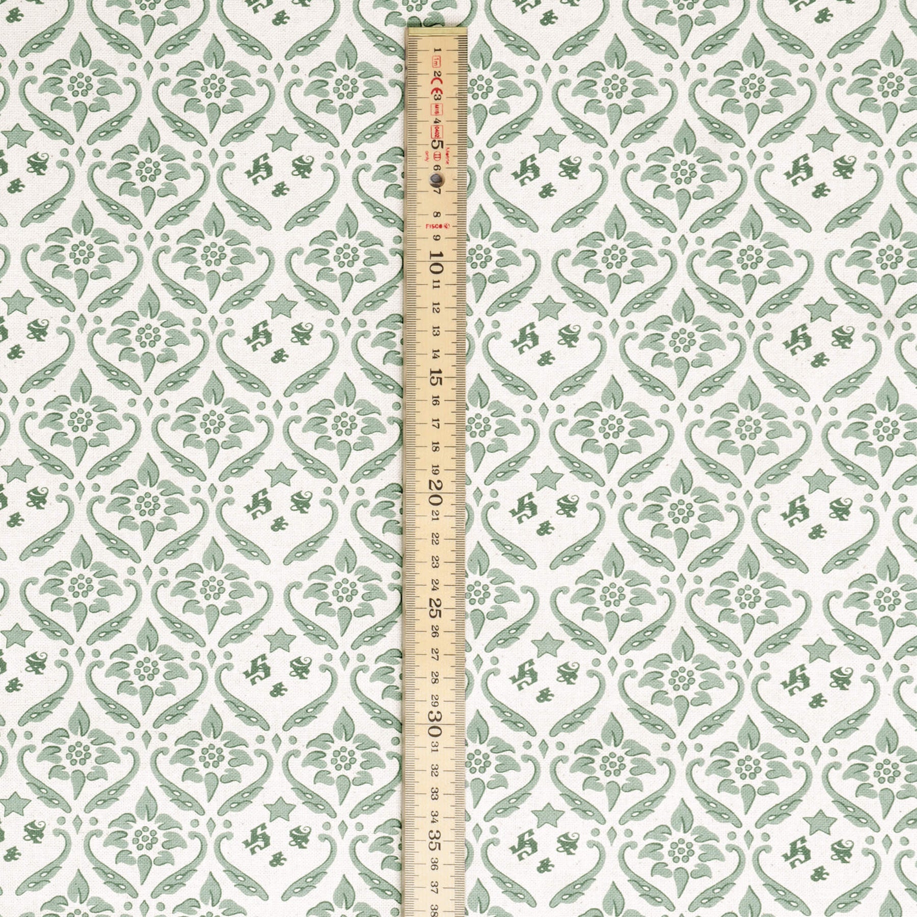 An updated version of our original design printed on a new cloth, Howard lichen fabric features a repeating pattern that showcases stylised blossoms framed by graceful, scrolling vine shapes, forming a symmetrical, lattice-like design