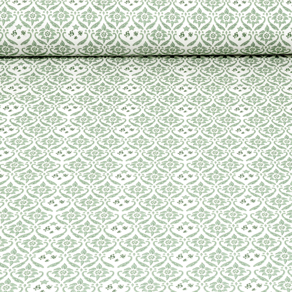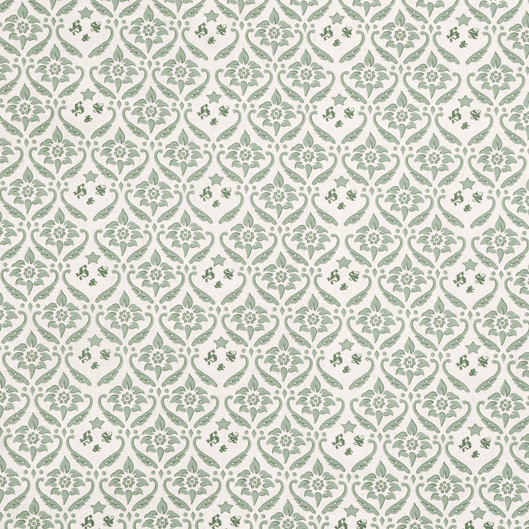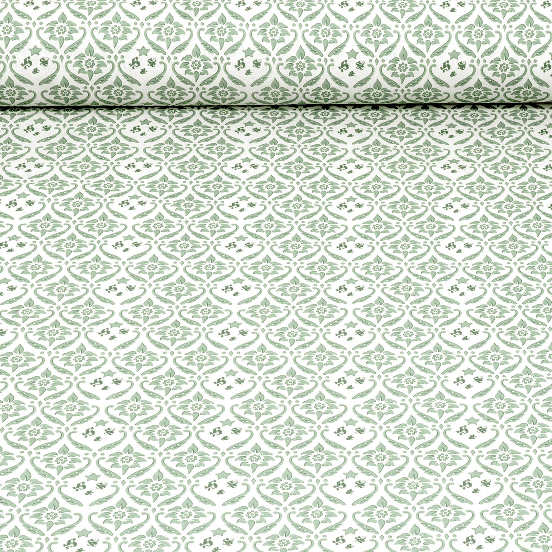 An updated version of our original design printed on a new cloth, Howard lichen fabric features a repeating pattern that showcases stylised blossoms framed by graceful, scrolling vine shapes, forming a symmetrical, lattice-like design