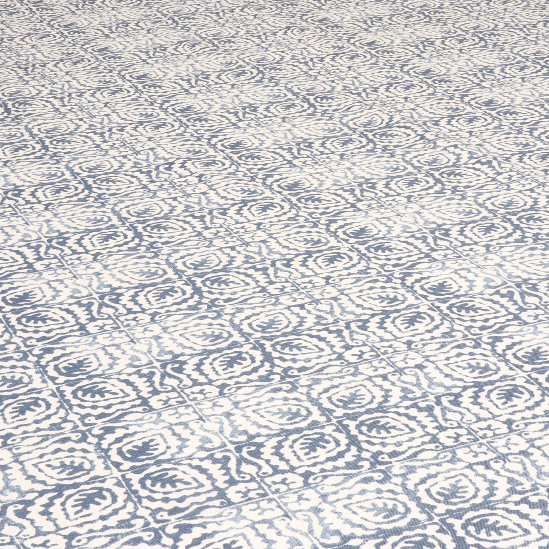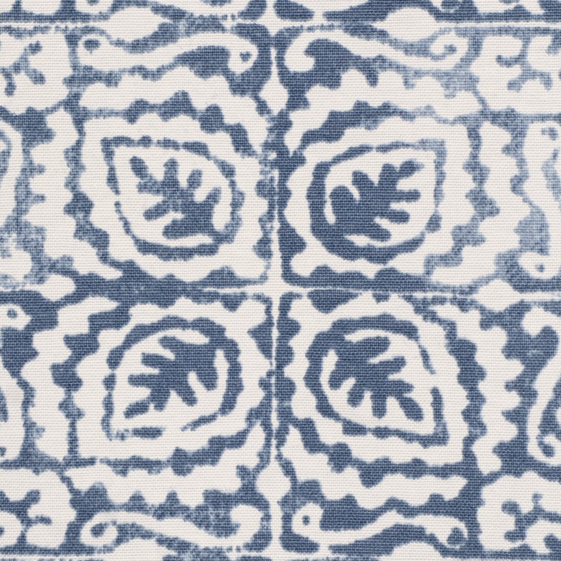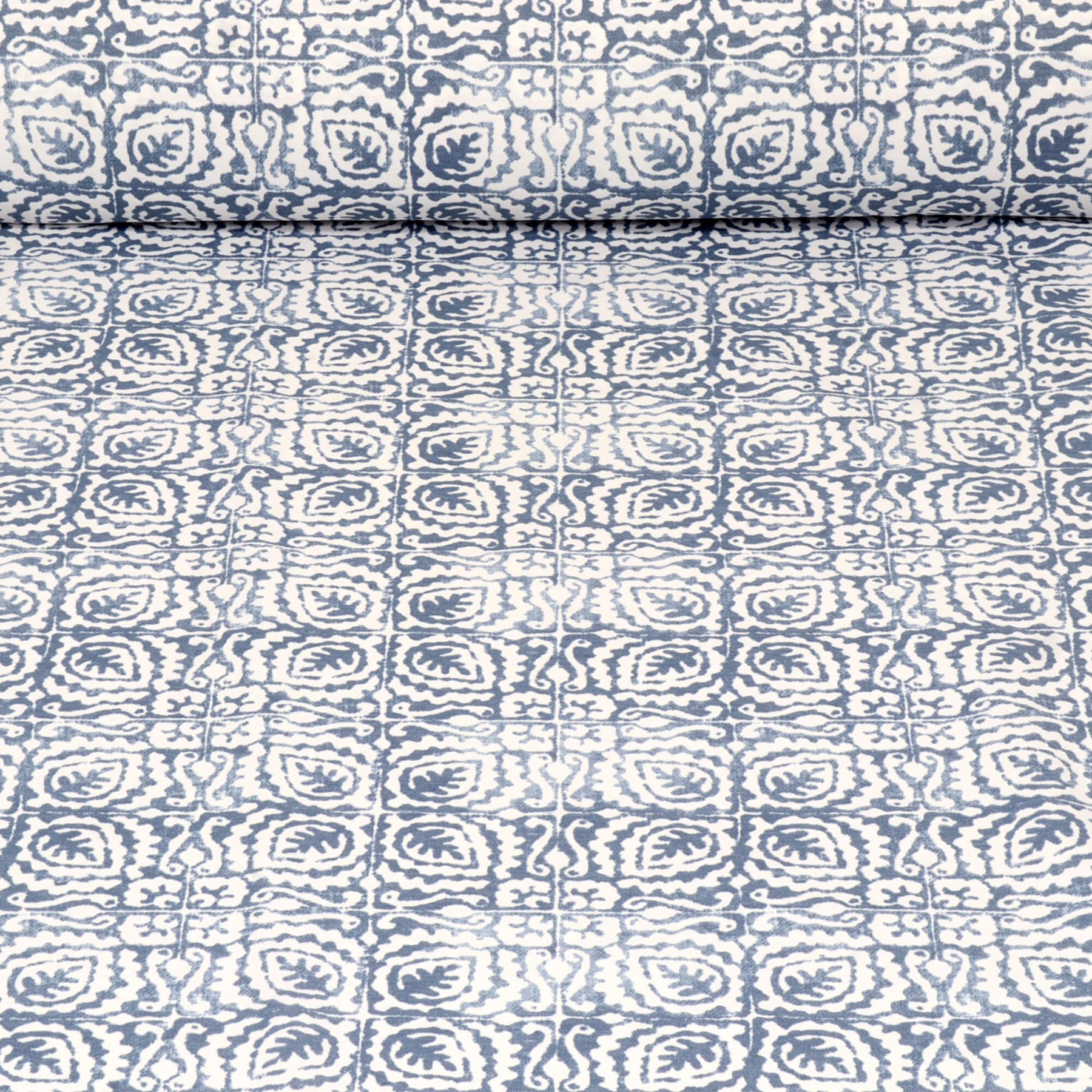 Margot from Prestigious Textiles features a batik-style design, which showcases repeating stylised leaf and paisley-inspired motifs arranged in a geometric grid, creating a balanced blend of organic shapes and structured symmetry.