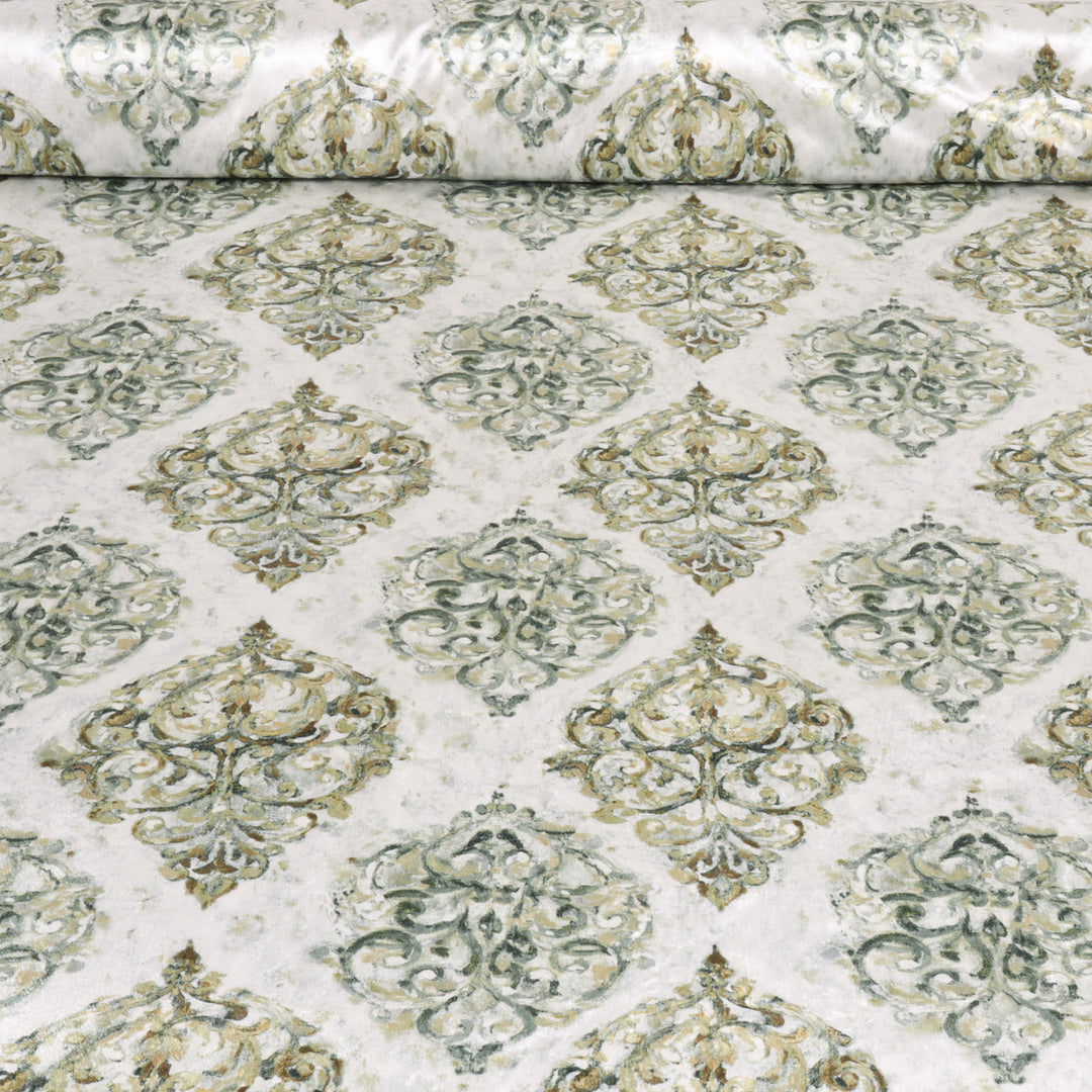Honour from Beaumont Textiles features a vintage-inspired damask pattern with a beautifully distressed design. Its rich colour pallet and soft, velvety quality help enhance it's timeless, antique charm.