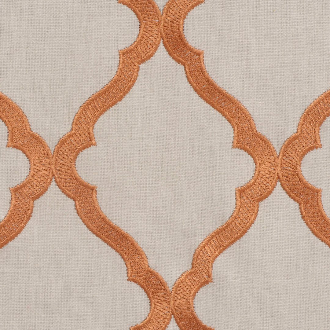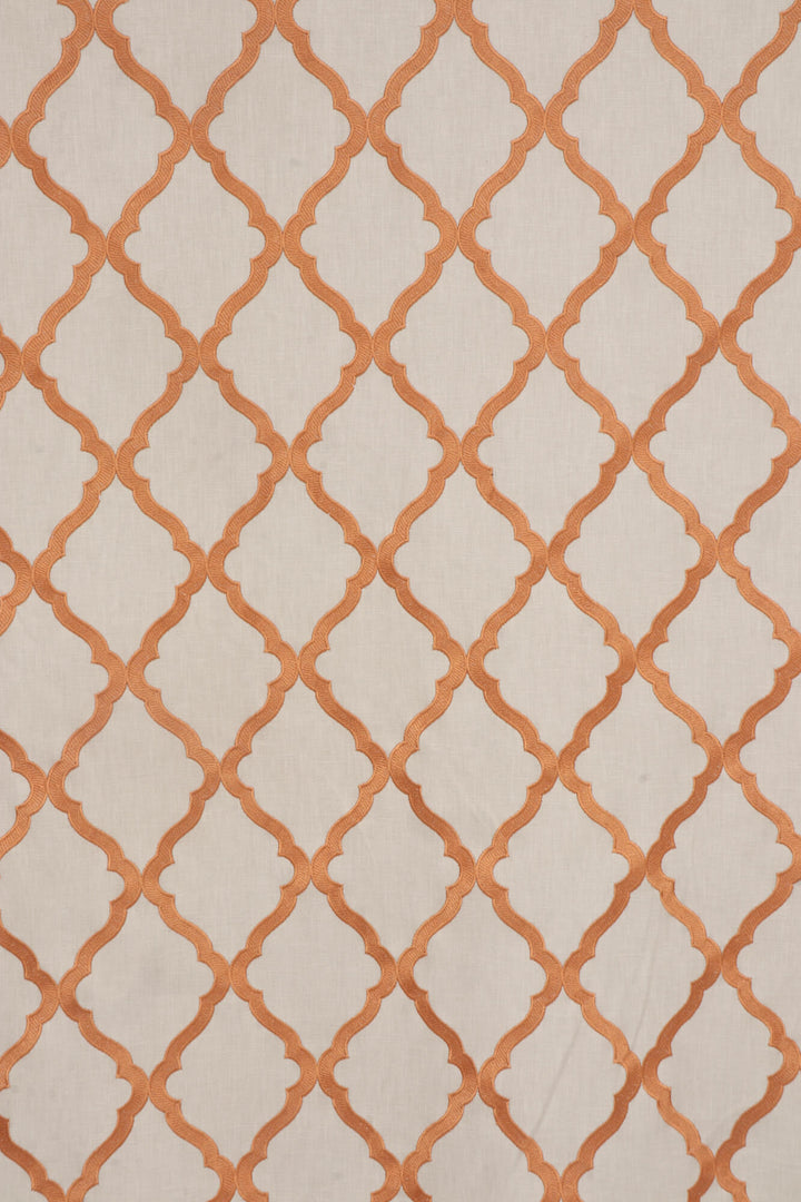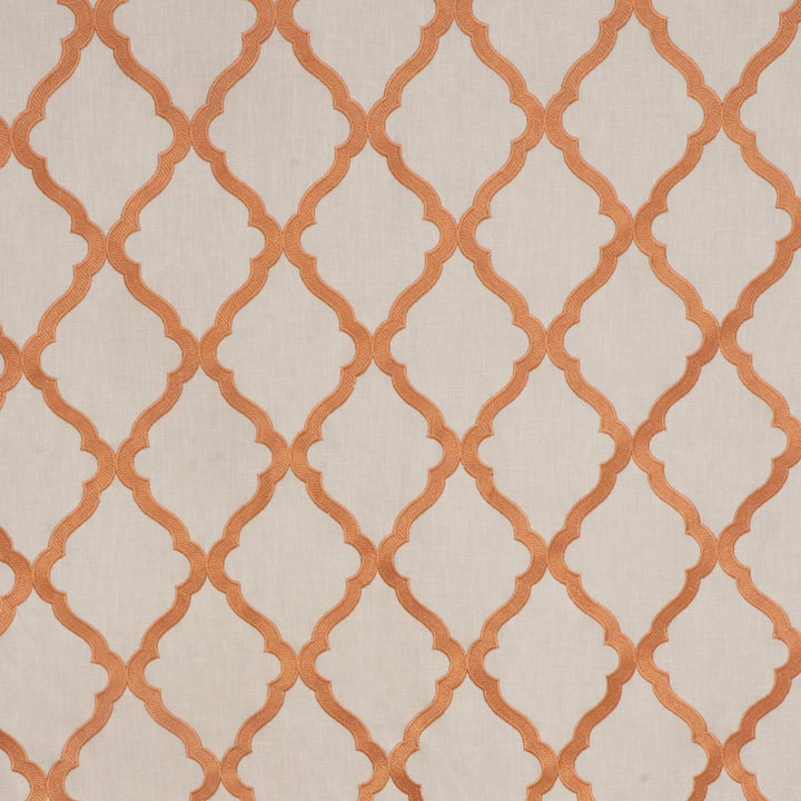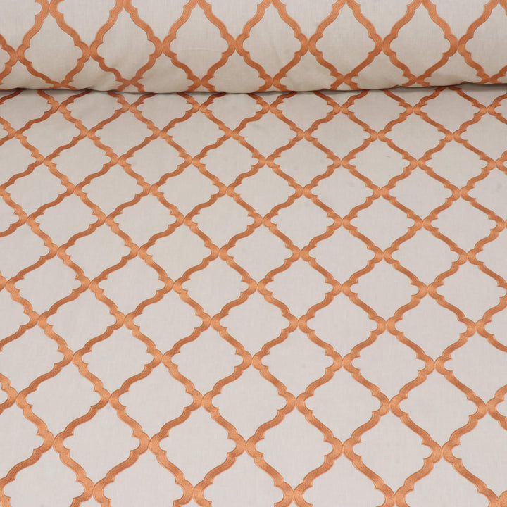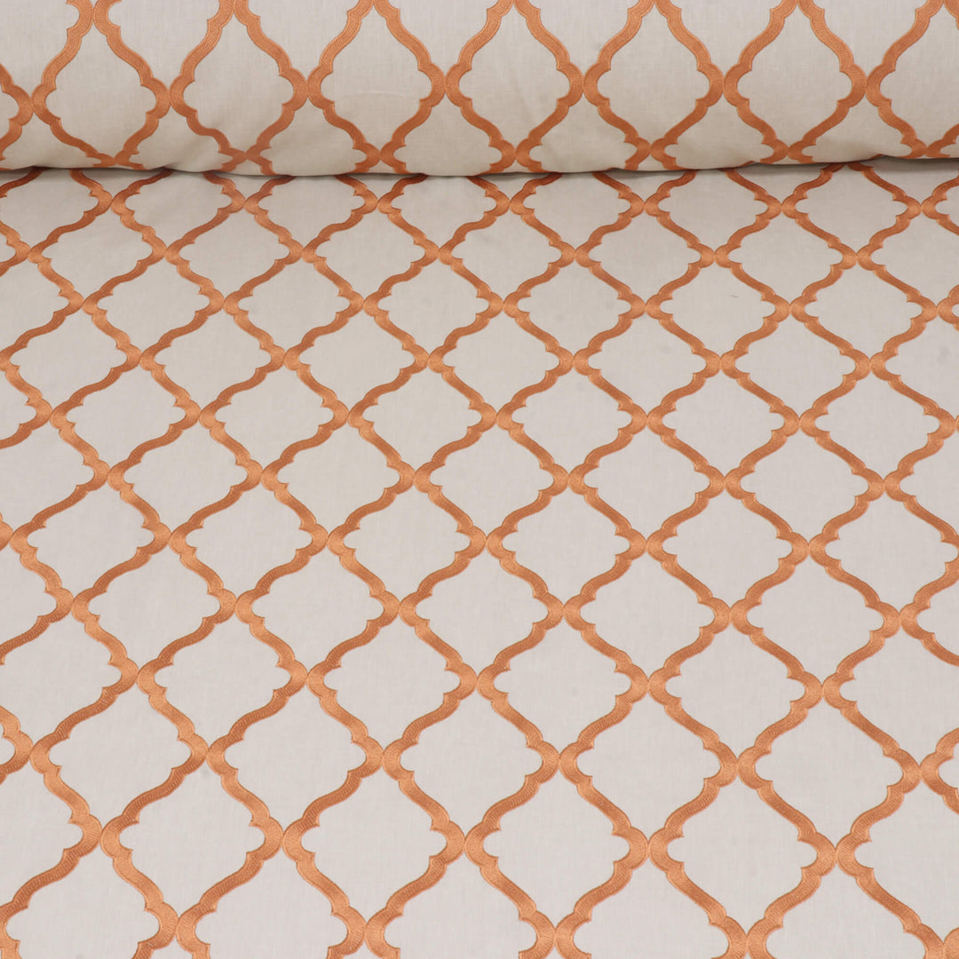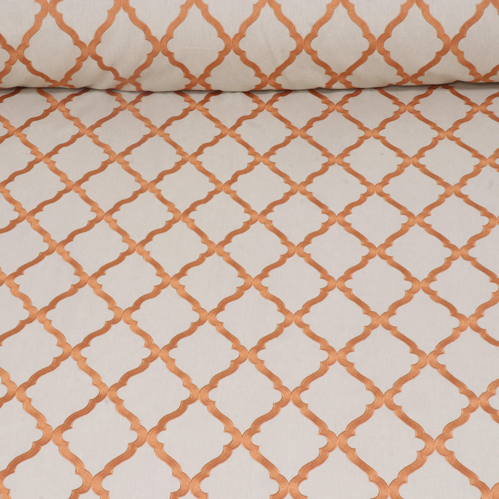 Karma fabric features a classic Moroccan trellis pattern, the design is composed of interlocking ogee shapes, creating a continuous lattice effect that exudes elegance and symmetry. This high-contrast pattern offers a sophisticated yet versatile look, making it ideal for both contemporary and traditional decor settings. Its timeless colour combination and clean design make it suitable for upholstery, draperies, or accent pieces, adding a refined touch to any space.