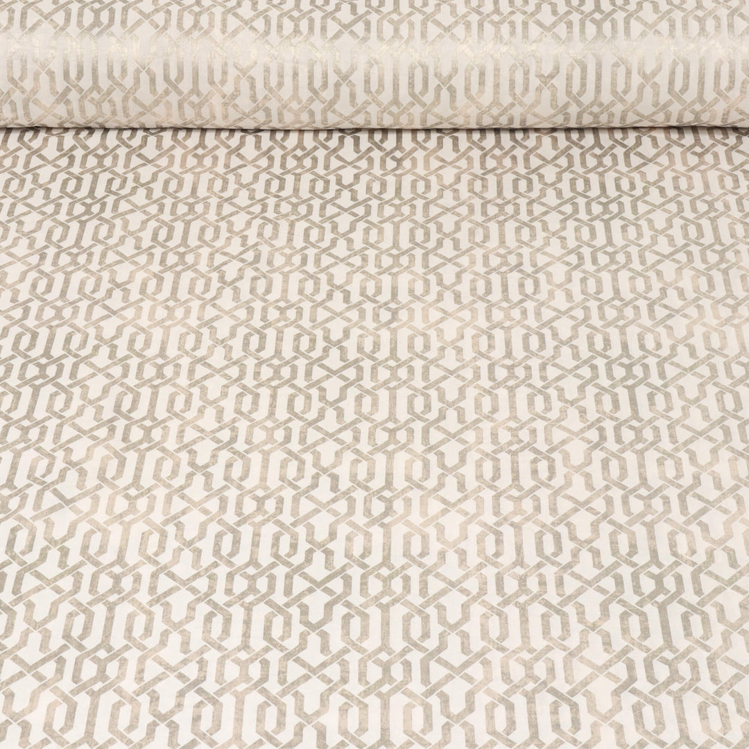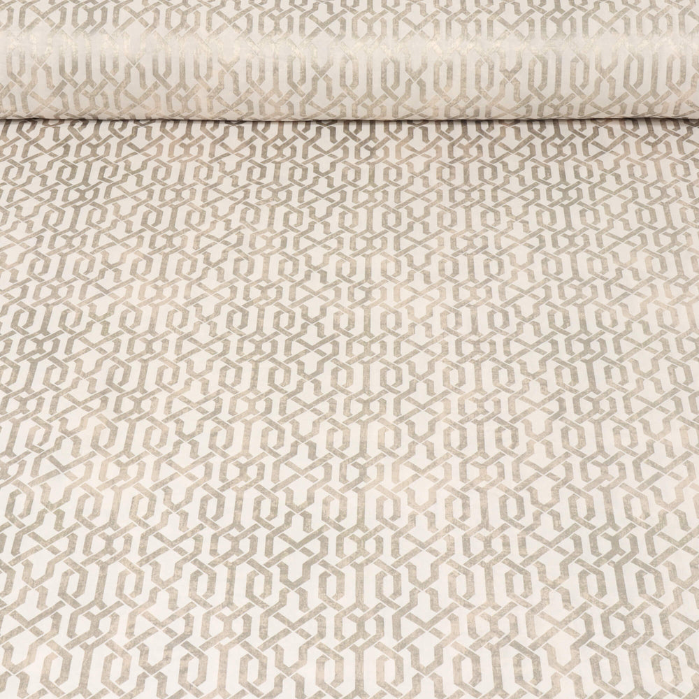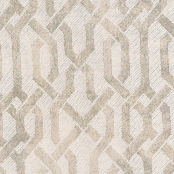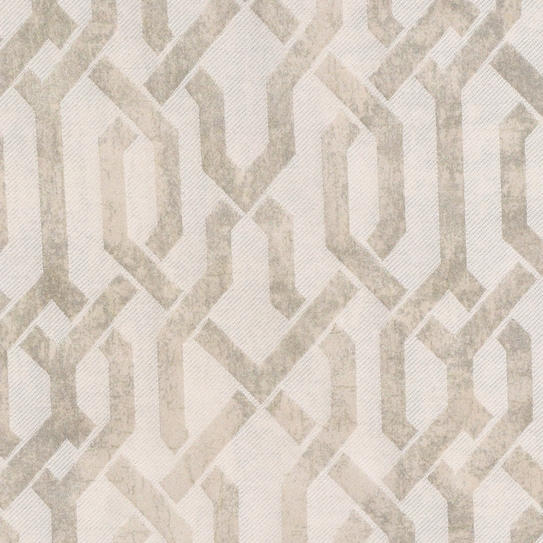 Trance Oystershell Fabric features an intricate geometric trellis pattern in shimmering ivory on a soft natural backdrop. Inspired by graceful natural curves and textures, the pattern exudes sophistication while maintaining a relaxed and calming aesthetic.