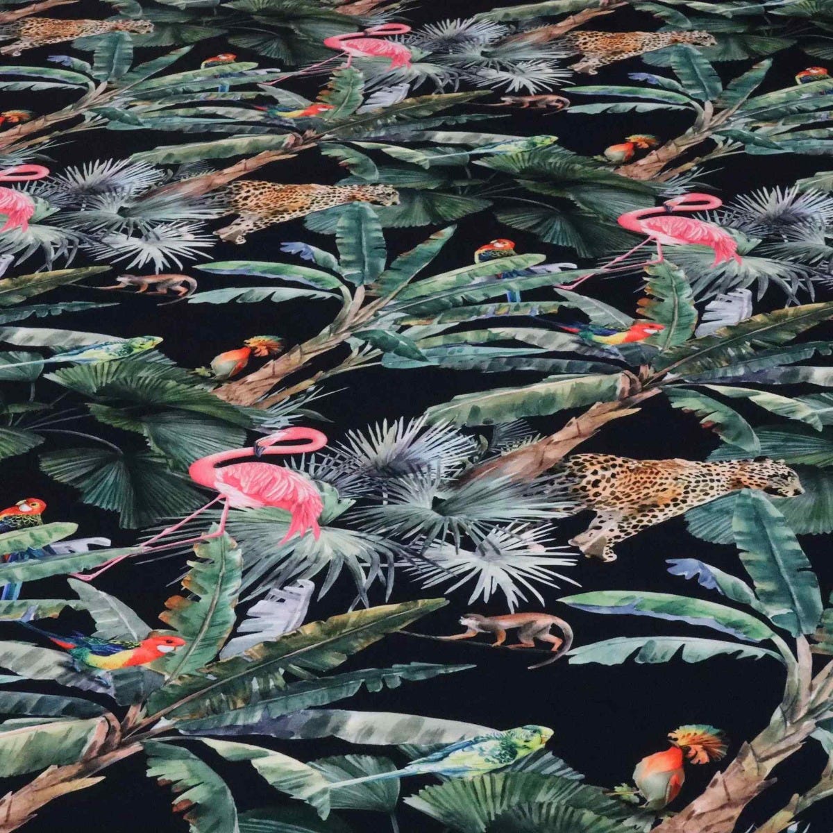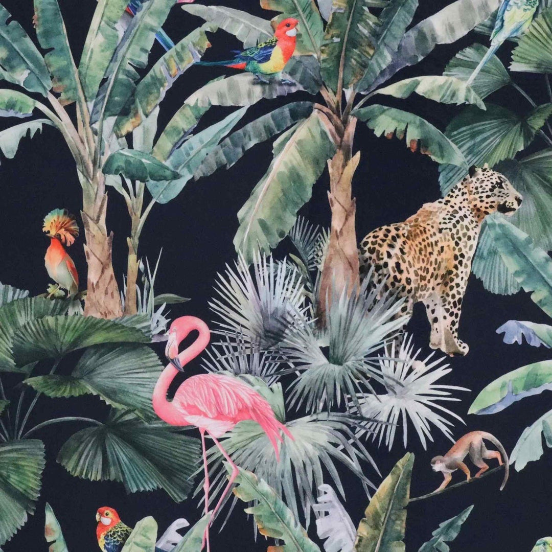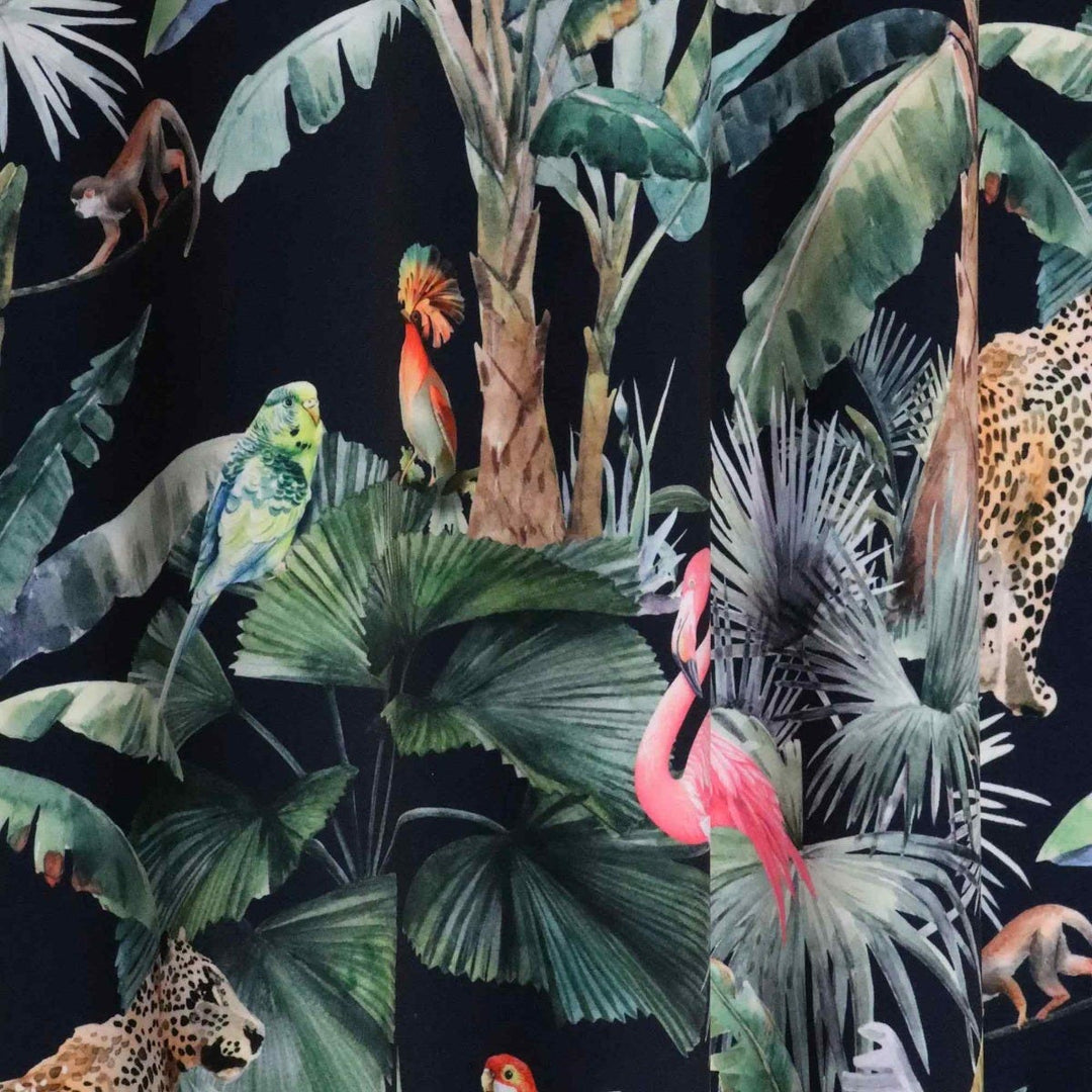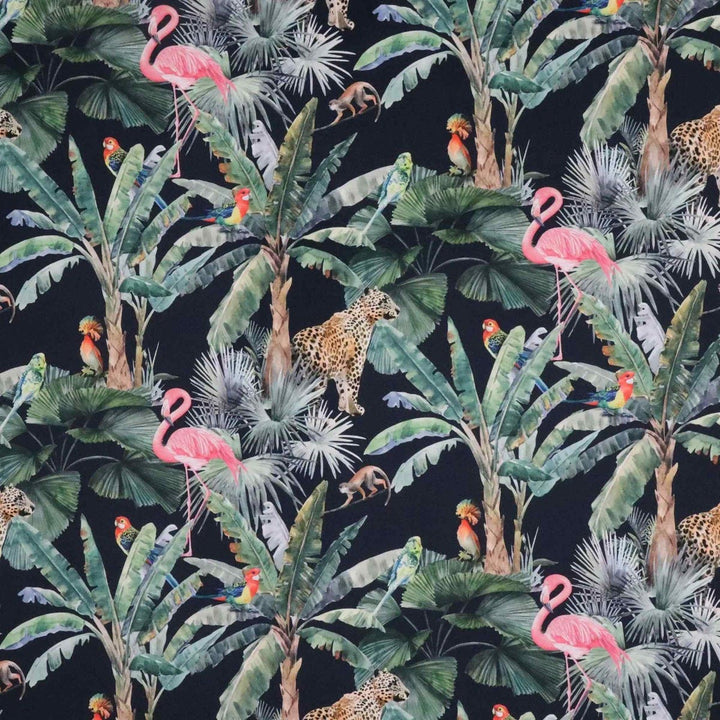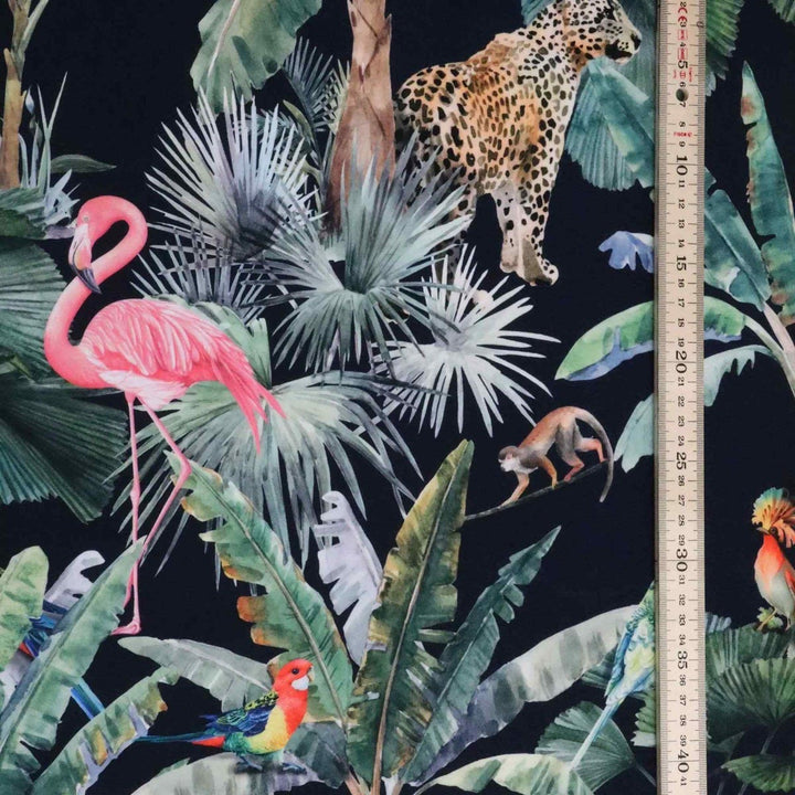 A wild and vibrant printed fabric, Wild Tropics is awash with bold and colourful iridescent exotic animals set against a contrasting deep black short pile velvet backdrop.