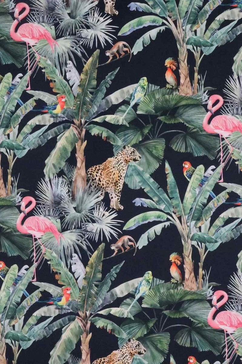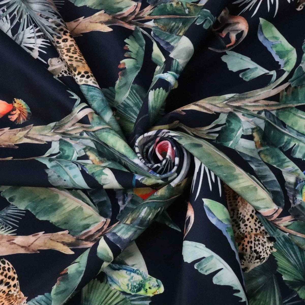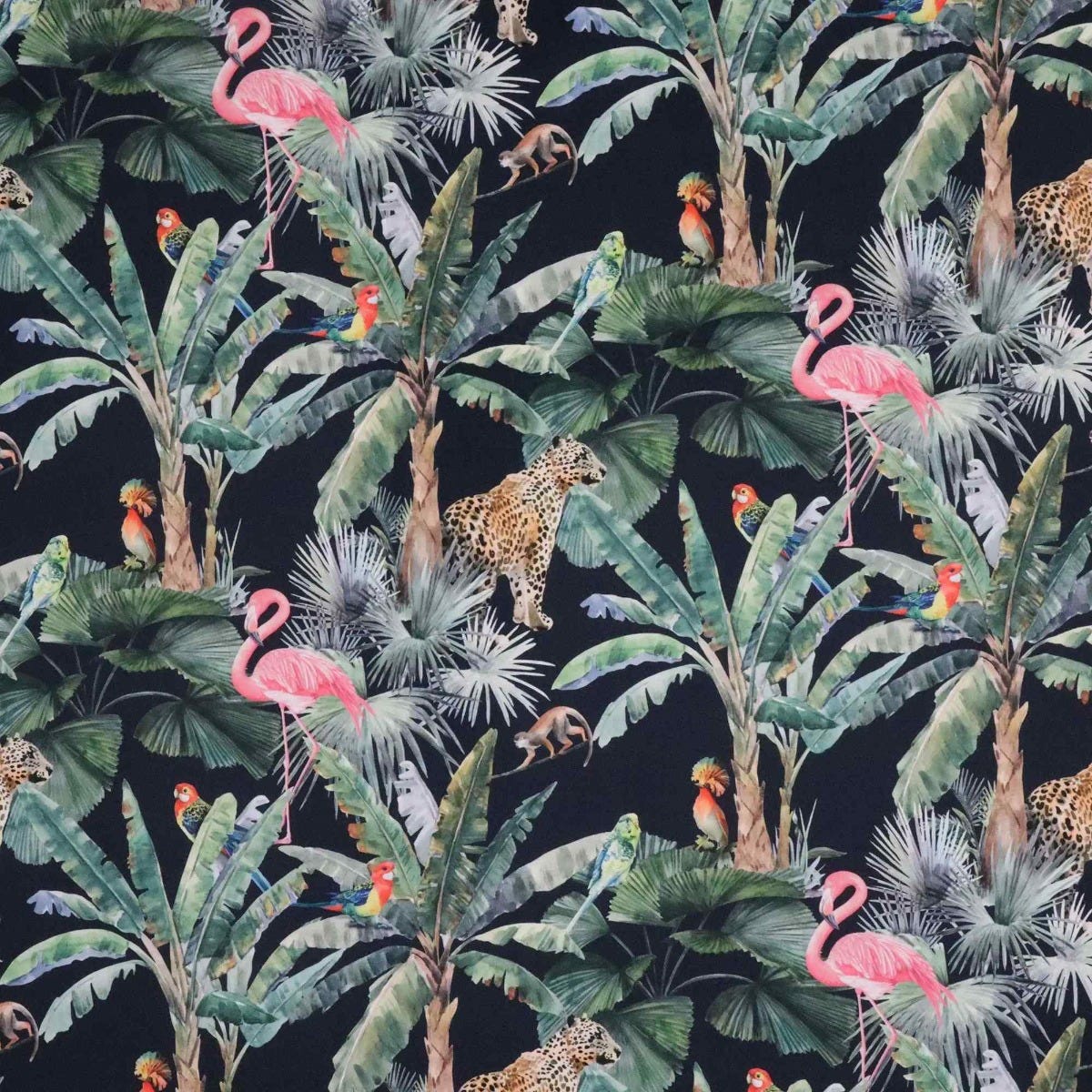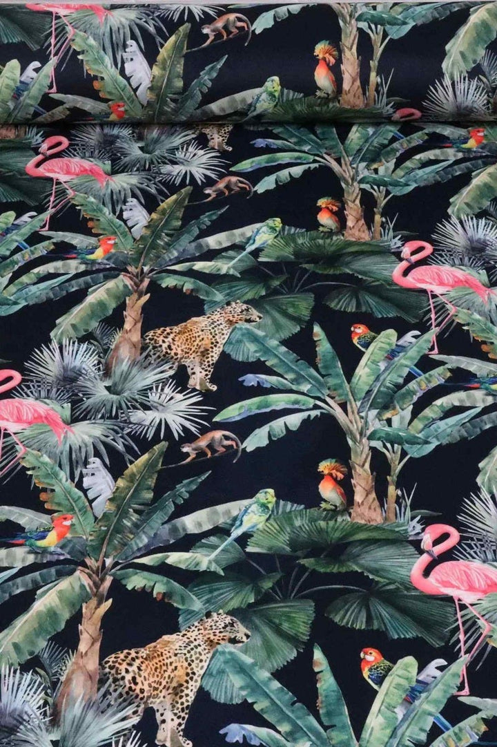 A wild and vibrant printed fabric, Wild Tropics is awash with bold and colourful iridescent exotic animals set against a contrasting deep black short pile velvet backdrop.