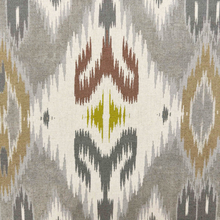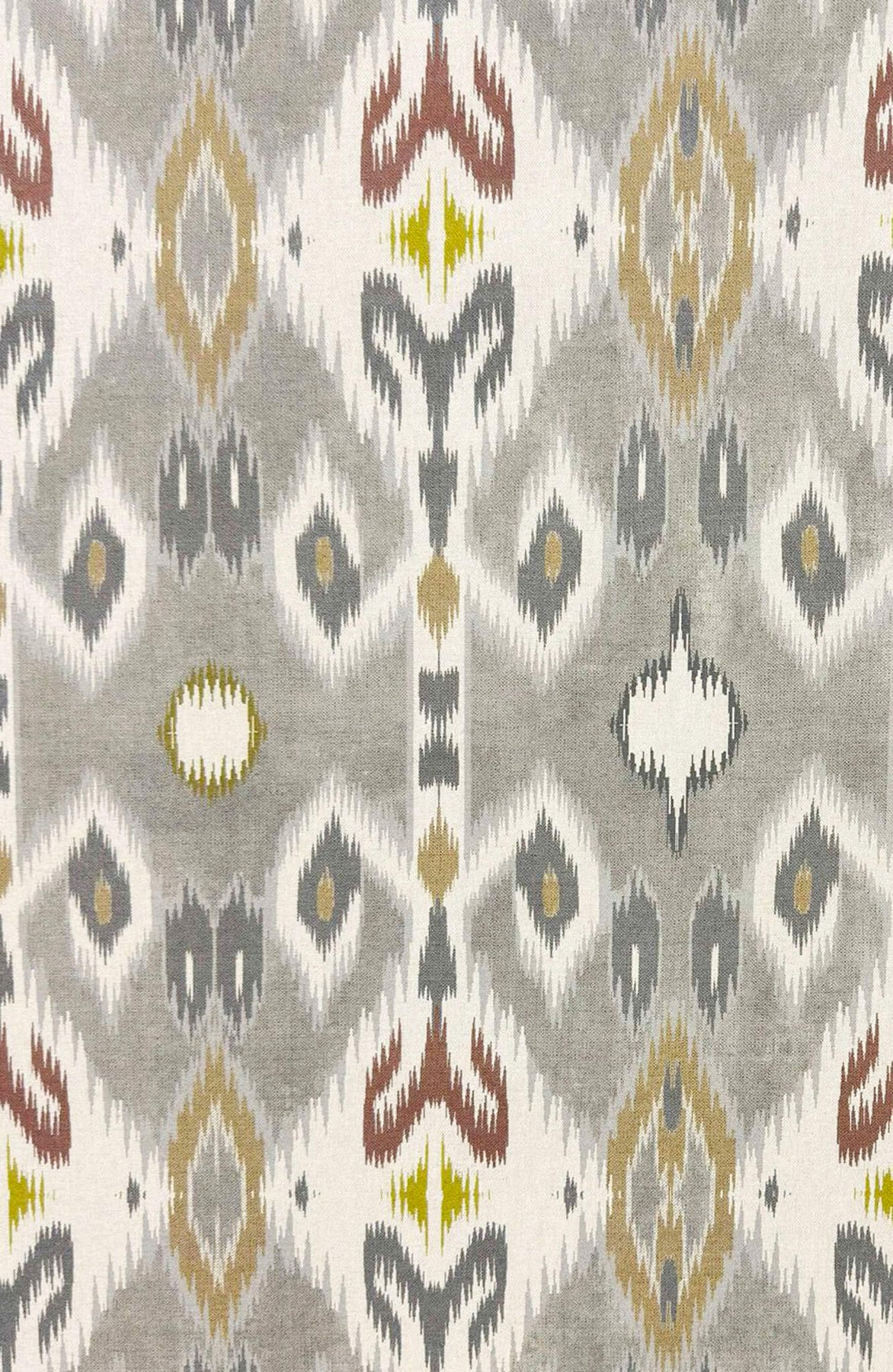 The Zena Ikat Grey fabric is a sophisticated cotton-linen blend showcasing a classic ikat pattern in a neutral palette. The pattern showcases symmetrical shapes with striking accents in grey, soft taupe, muted mustard, and touches of earthy rust to create a calming yet intricate design.