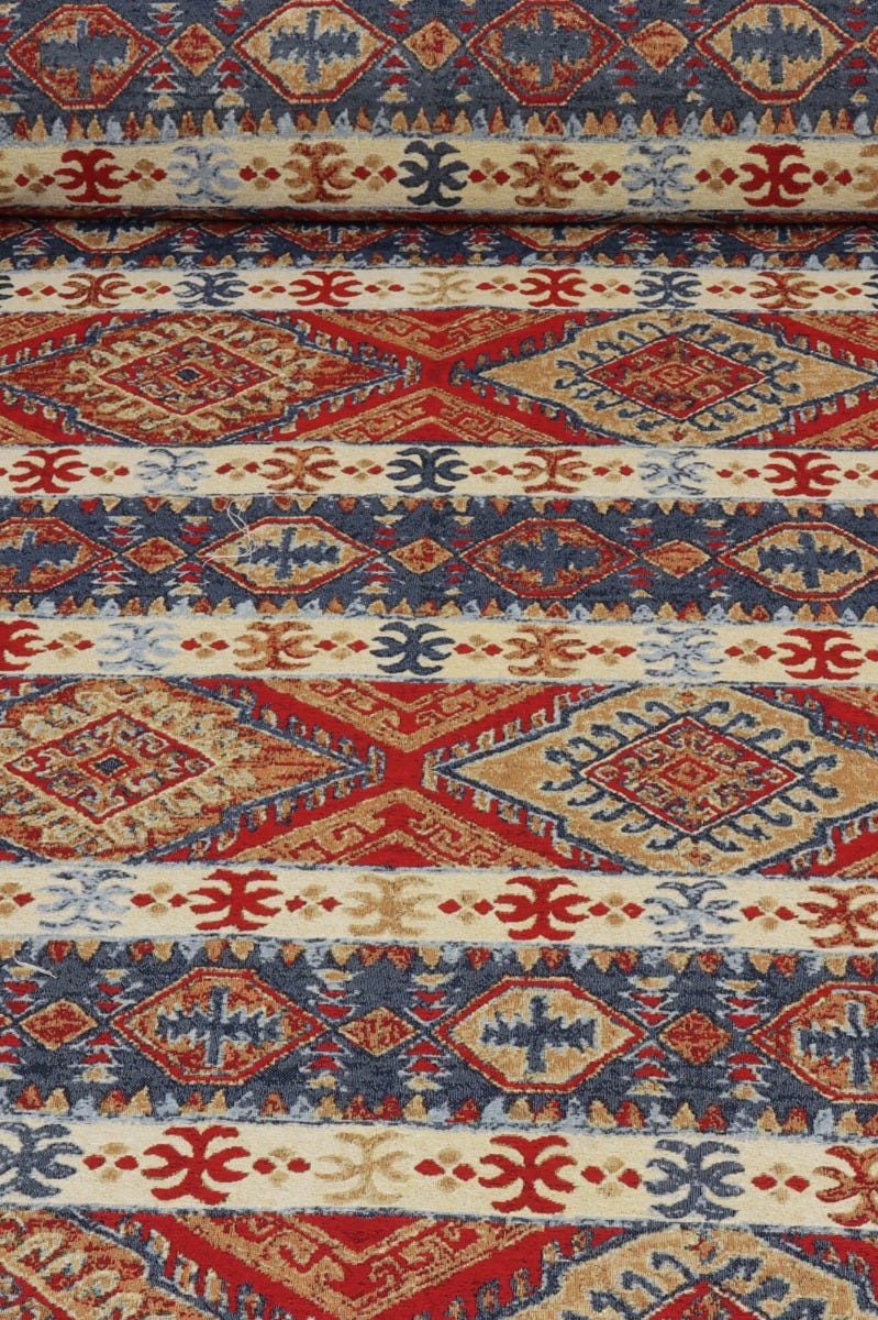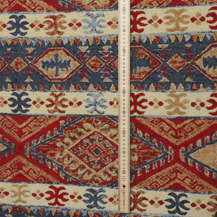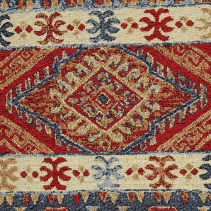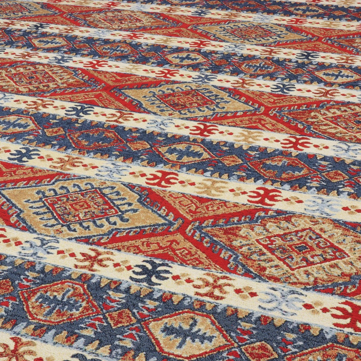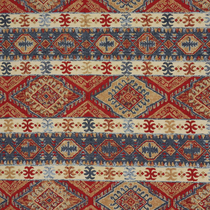 A striking, Kazak inspired tapestry fabric with intricate, Middle Eastern inspired patterns in a rich red and blue colourway.
