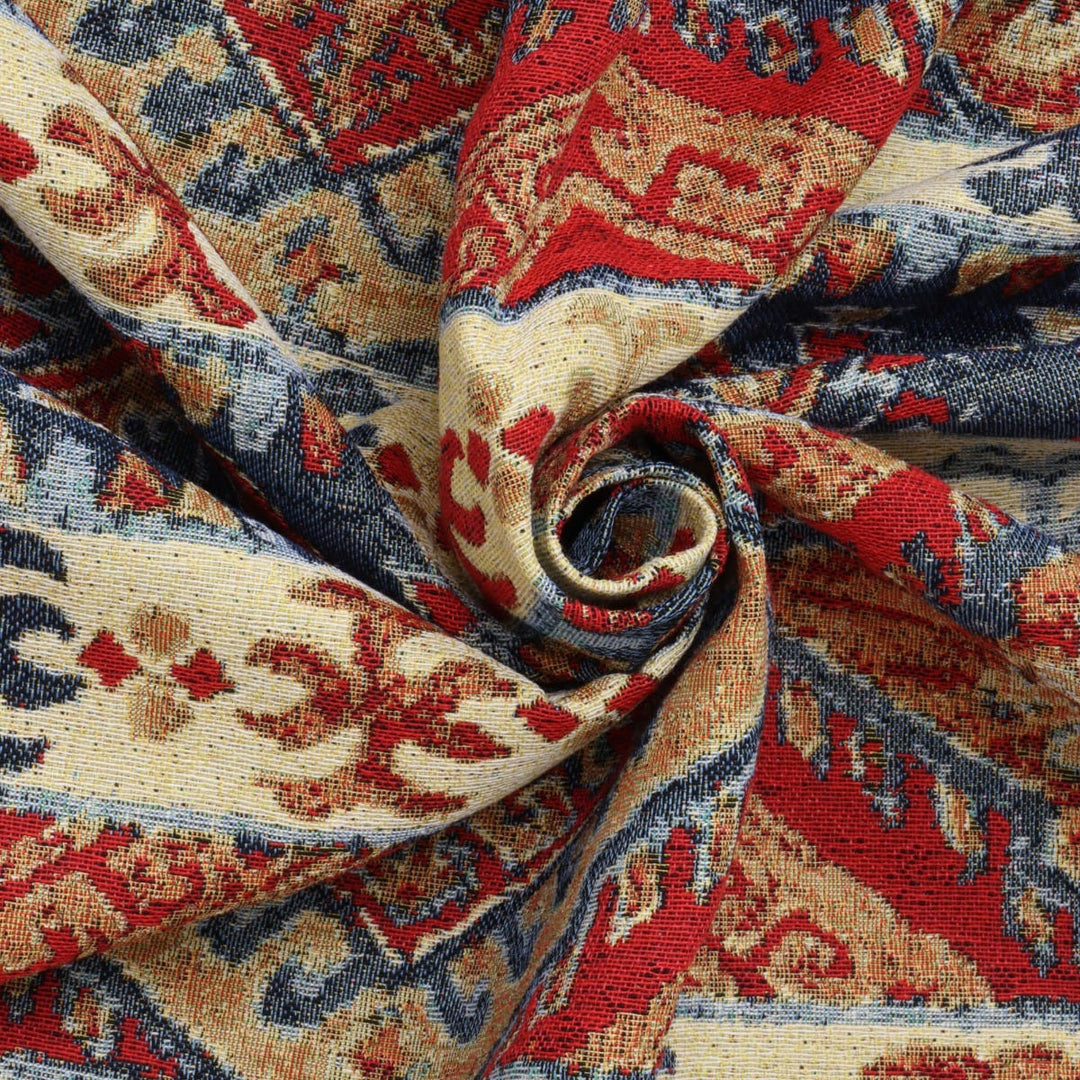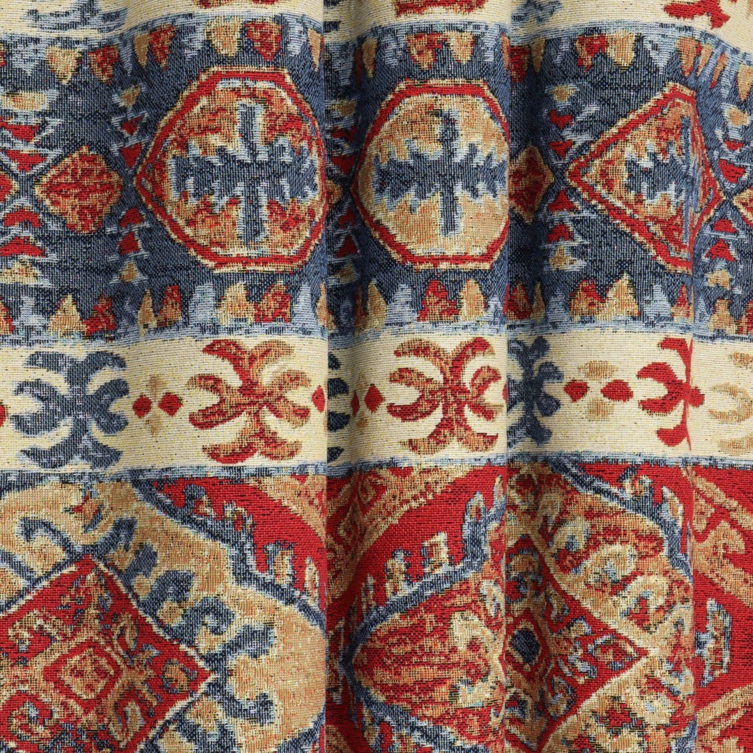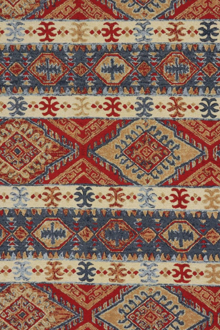 A striking, Kazak inspired tapestry fabric with intricate, Middle Eastern inspired patterns in a rich red and blue colourway.