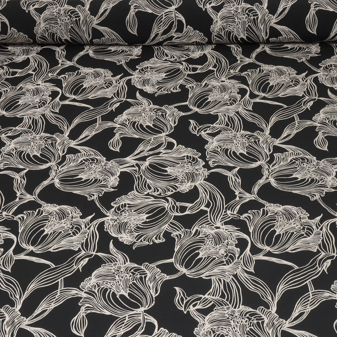 Crafted from a luxurious blend of 72% polyester and 28% viscose, Cecily is soft to the touch while being durable enough for various uses, including curtains, cushions, light upholstery and dressmaking. The intricate floral patterns bring a touch of nature-inspired sophistication, while the contrast between the neutral tones and dark base creates a statement piece for any room.