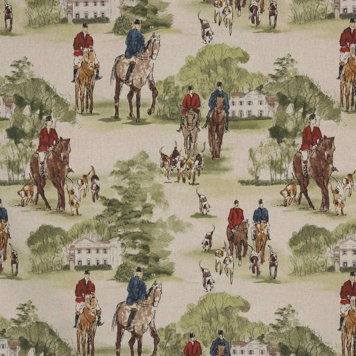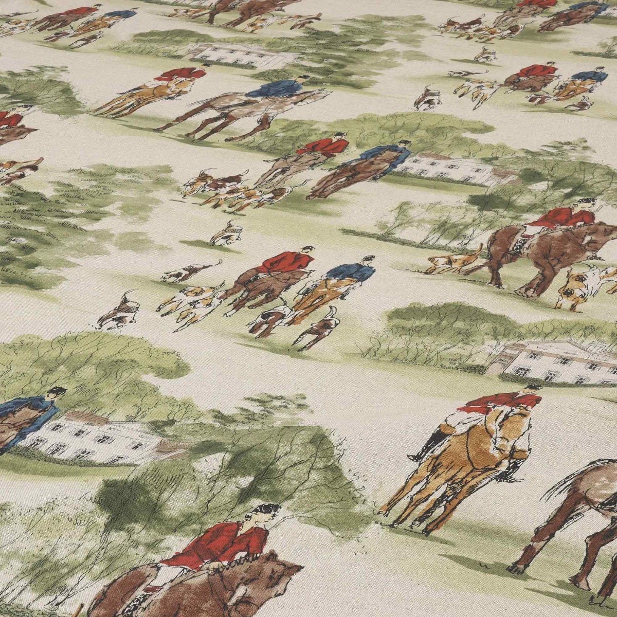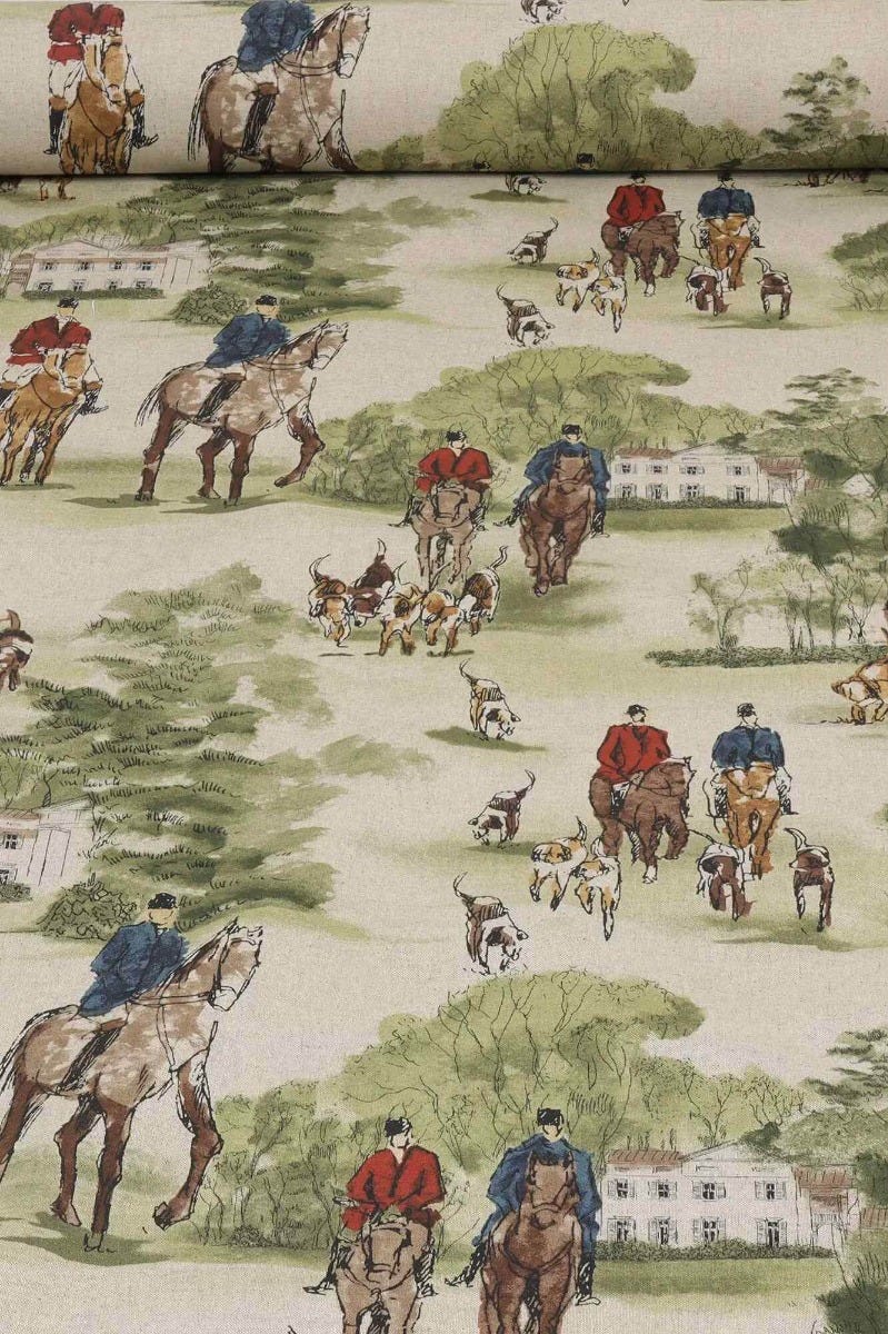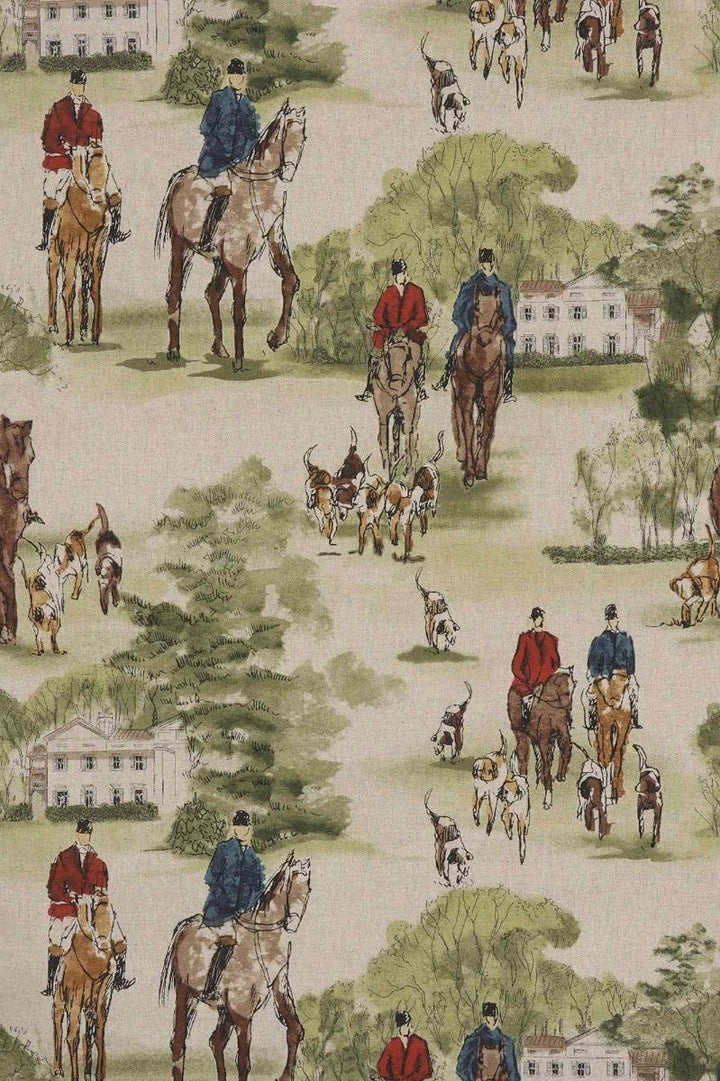 A double-width fabric, Crosby Hunting depicts the scenes when horses and hounds embark on the hunt  amongst a backdrop of lush countryside and grand stately homes, finished in a lovely painterly form.