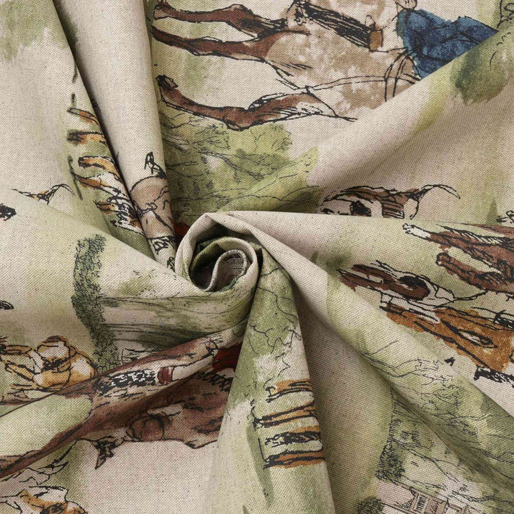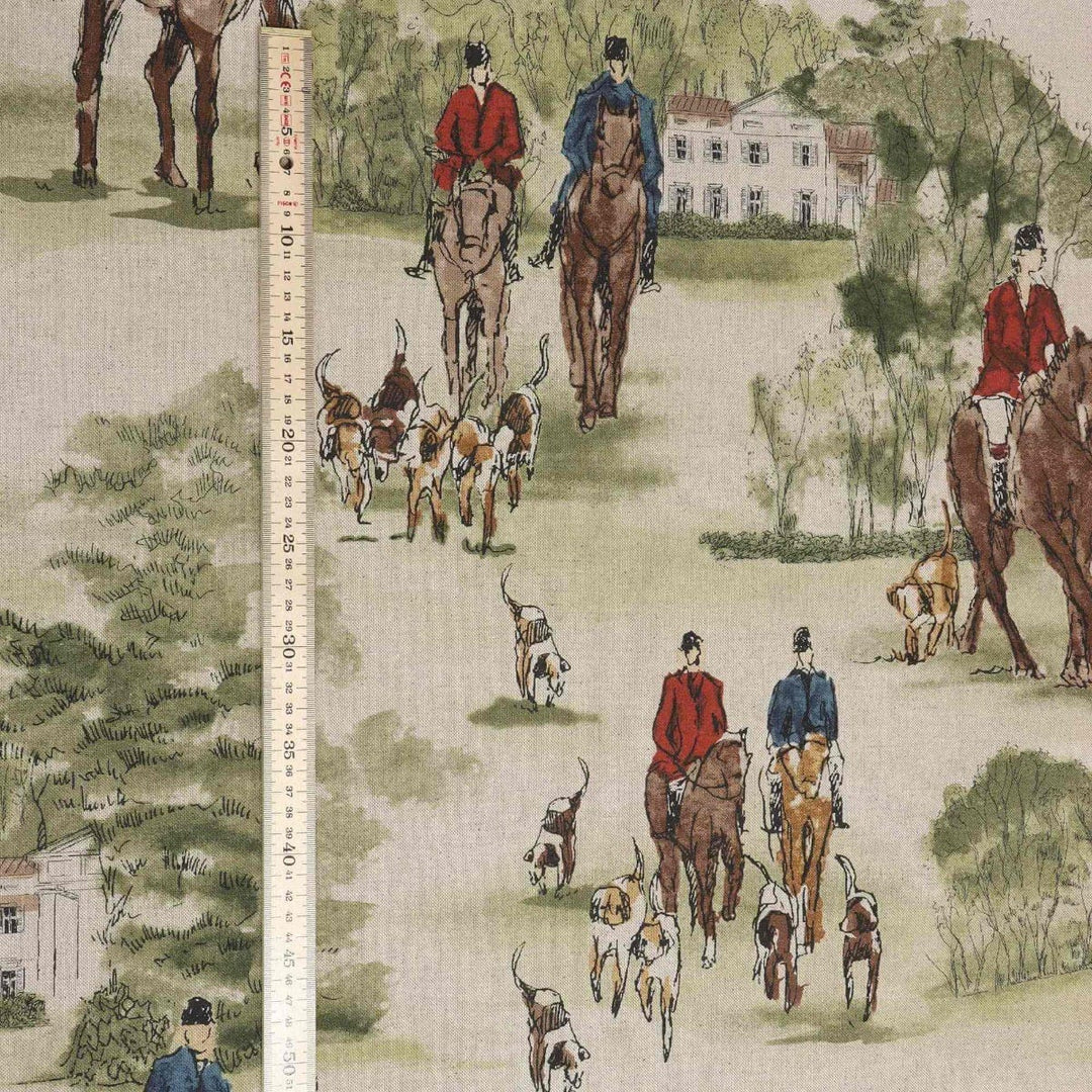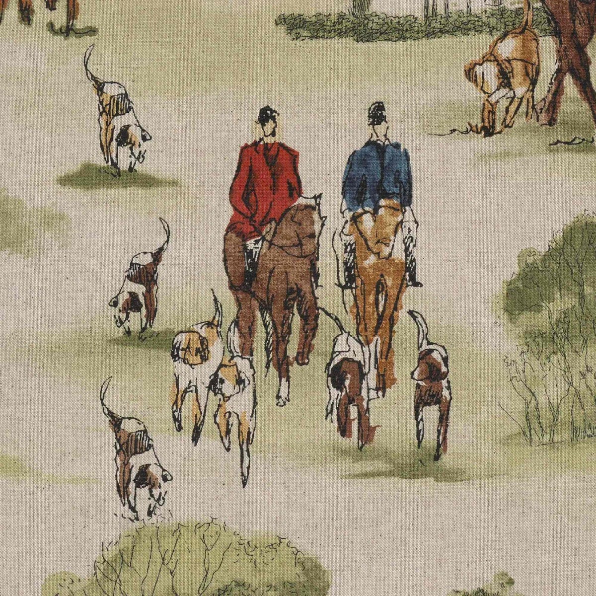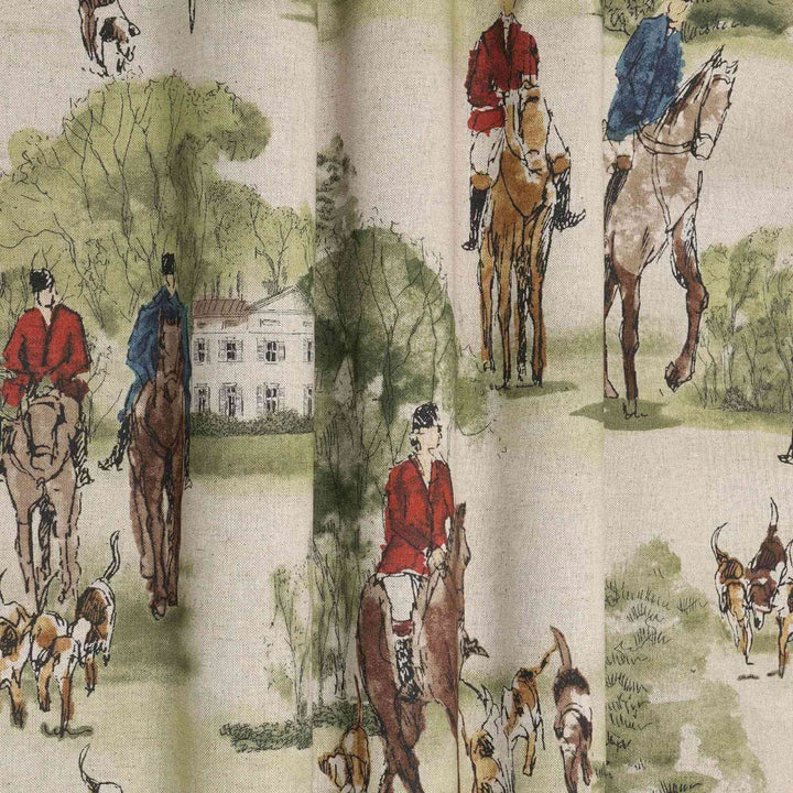 A double-width fabric, Crosby Hunting depicts the scenes when horses and hounds embark on the hunt  amongst a backdrop of lush countryside and grand stately homes, finished in a lovely painterly form.