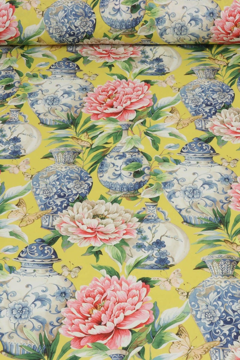 Printed on a crisp, high quality 100% cotton cloth, Dorchester Floral has a classic charm in the design. Large peony blooms are intertwined amongst traditional blue chinaware and fluttering butterflies on a lemon yellow back drop which beautifully compliments the depth of colour in the design.