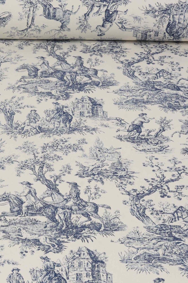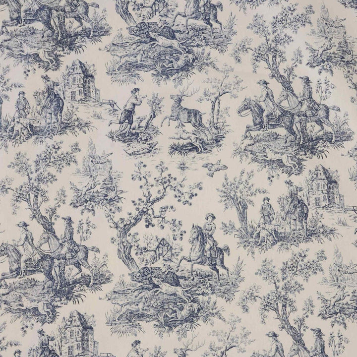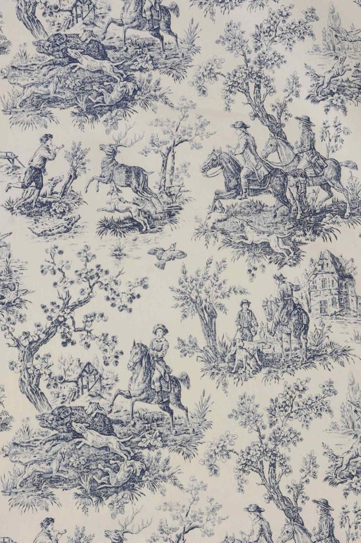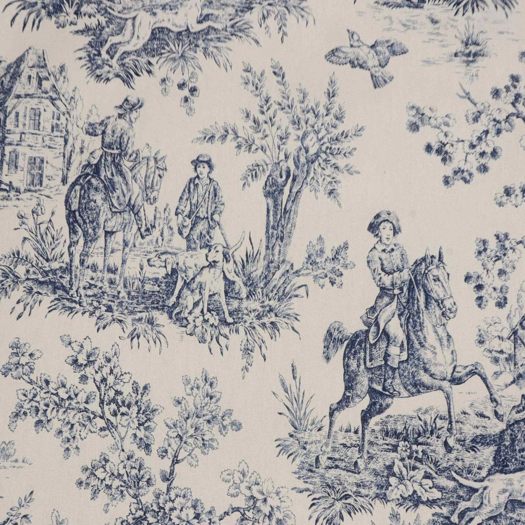 In wonderful detail, French Hunting Toile fabric takes inspiration from the classic Toile De Juoy patterns depicting rural life in 18th century France. Hunting Toile features stunning scenes as the hunt embark, featuring men on horse back, hounds and the hunted stag. Printed on a high quality 100% cotton in a blue and slightly off white background, Hunting Toile is suitable for curtains, blinds, cushions, soft furnishings and upholstery. A charming fabric that would work beautifully in traditional interiors and country homes.
