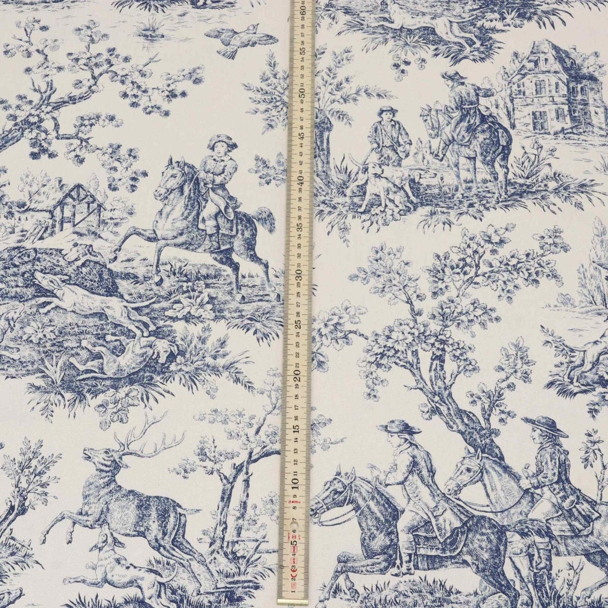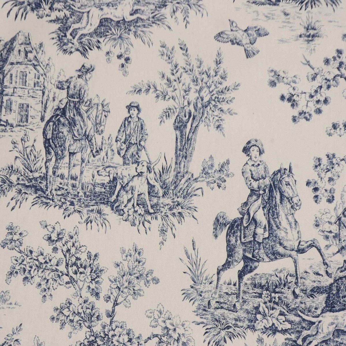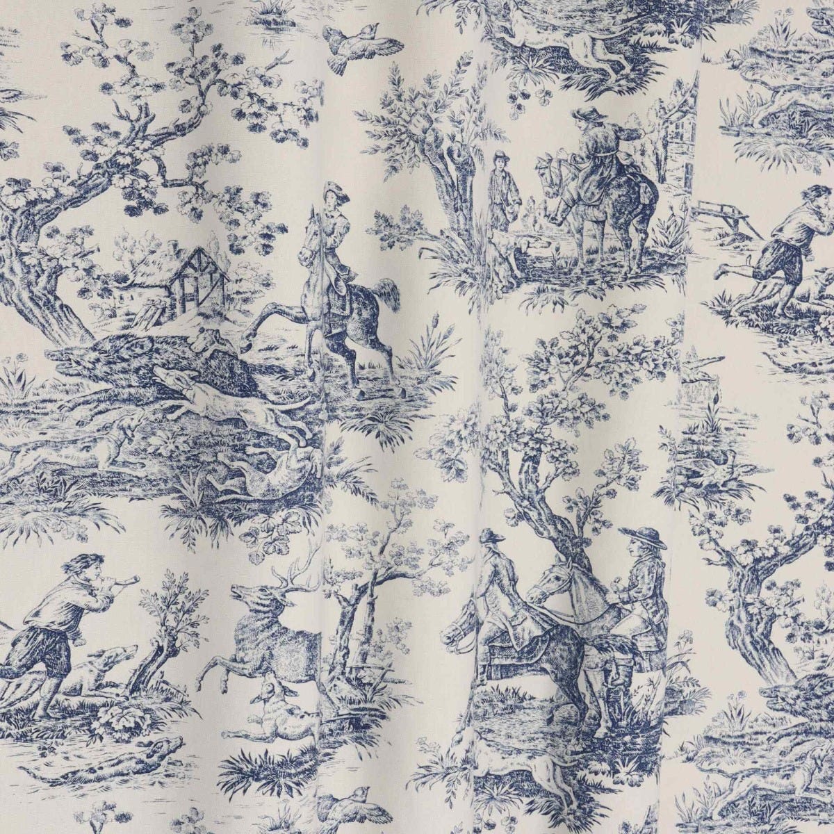 In wonderful detail, French Hunting Toile fabric takes inspiration from the classic Toile De Juoy patterns depicting rural life in 18th century France. Hunting Toile features stunning scenes as the hunt embark, featuring men on horse back, hounds and the hunted stag. Printed on a high quality 100% cotton in a blue and slightly off white background, Hunting Toile is suitable for curtains, blinds, cushions, soft furnishings and upholstery. A charming fabric that would work beautifully in traditional interiors and country homes.