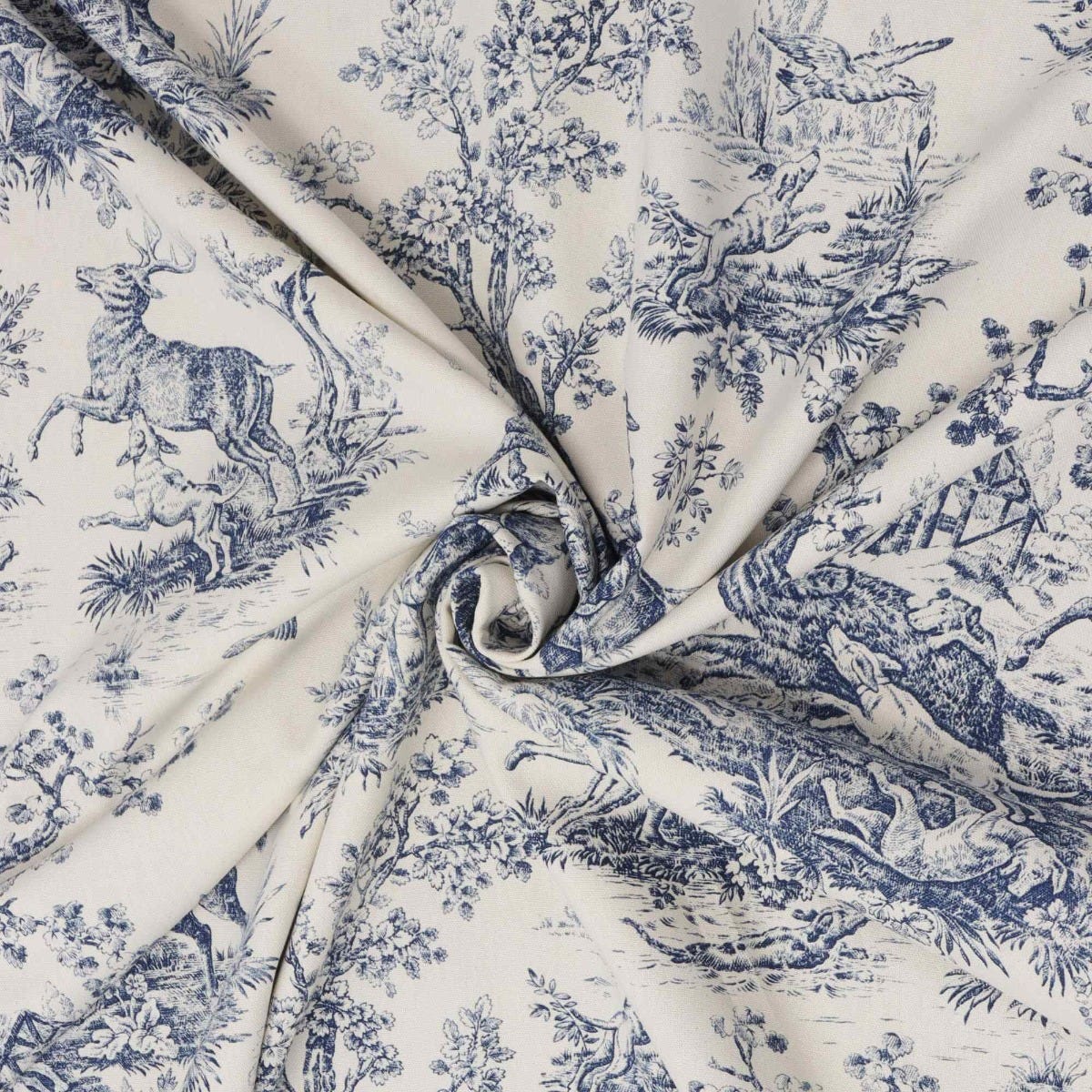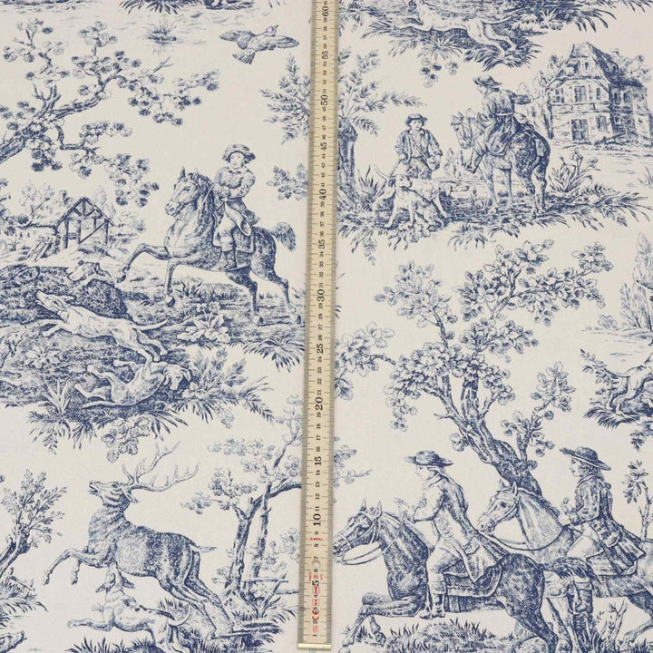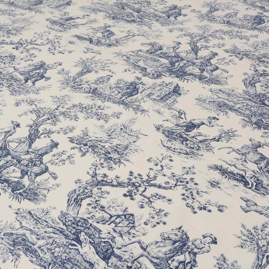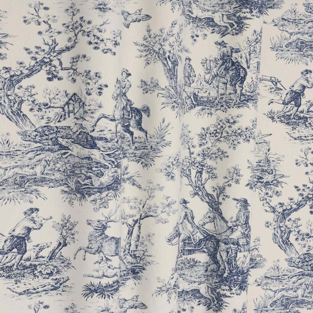 Double Width French Hunting Toile Blue On White Fabric