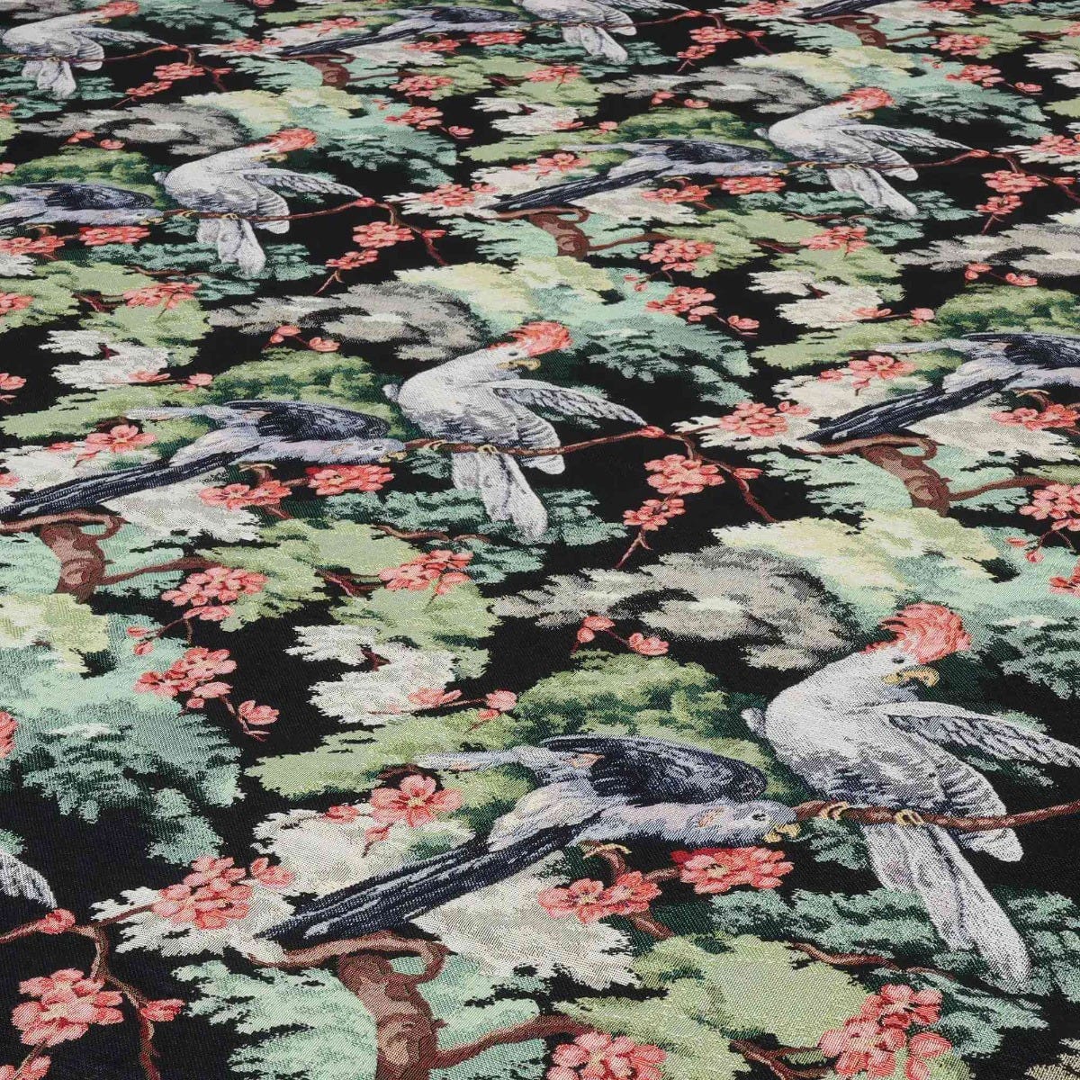Exotic Birds is a beautifully detailed woven fabric featuring exotic birds such as parrots and Cherokee against a rich green backdrop of the lush jungle canopy, its high quality detail making it so beautiful you might as well hang it on the wall.