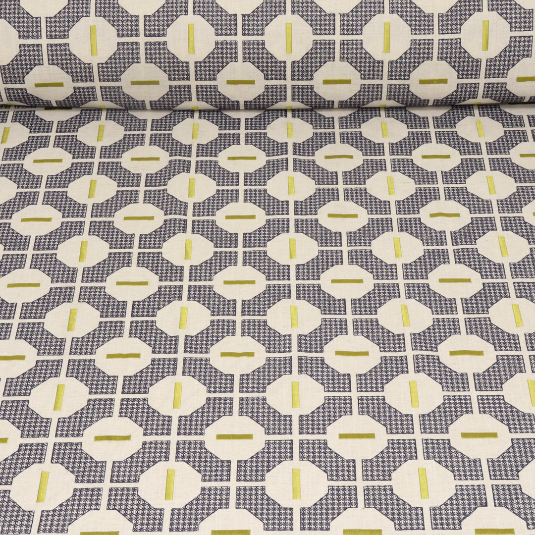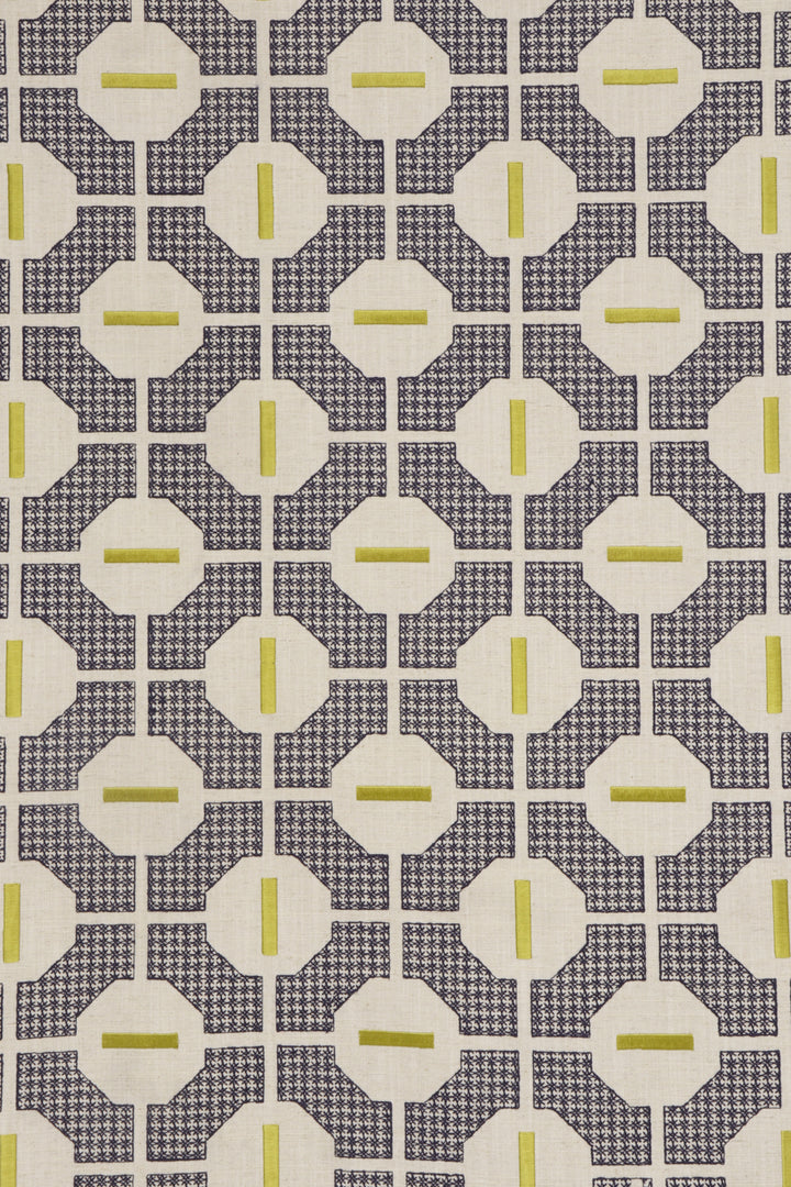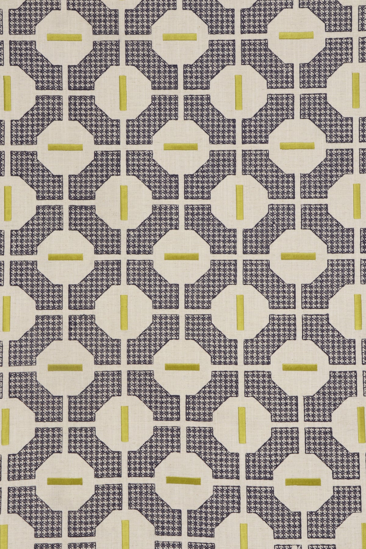 Rumba from Beaumont Textiles features a bold geometric pattern with interlocking shapes. The symmetrical pattern creates a visually engaging, modern look, blending traditional textile motifs with contemporary aesthetics.