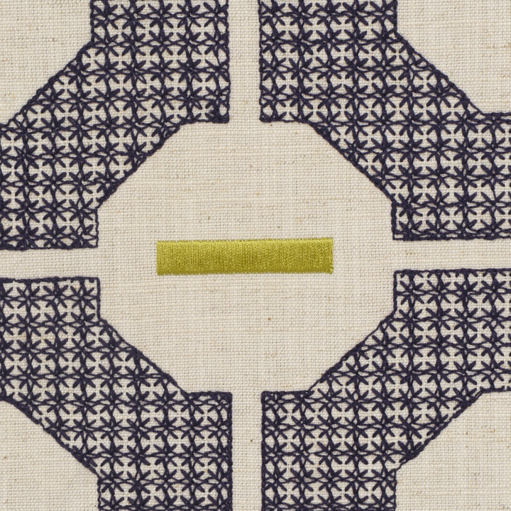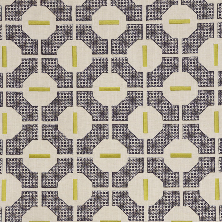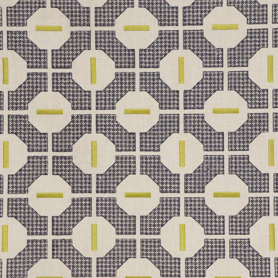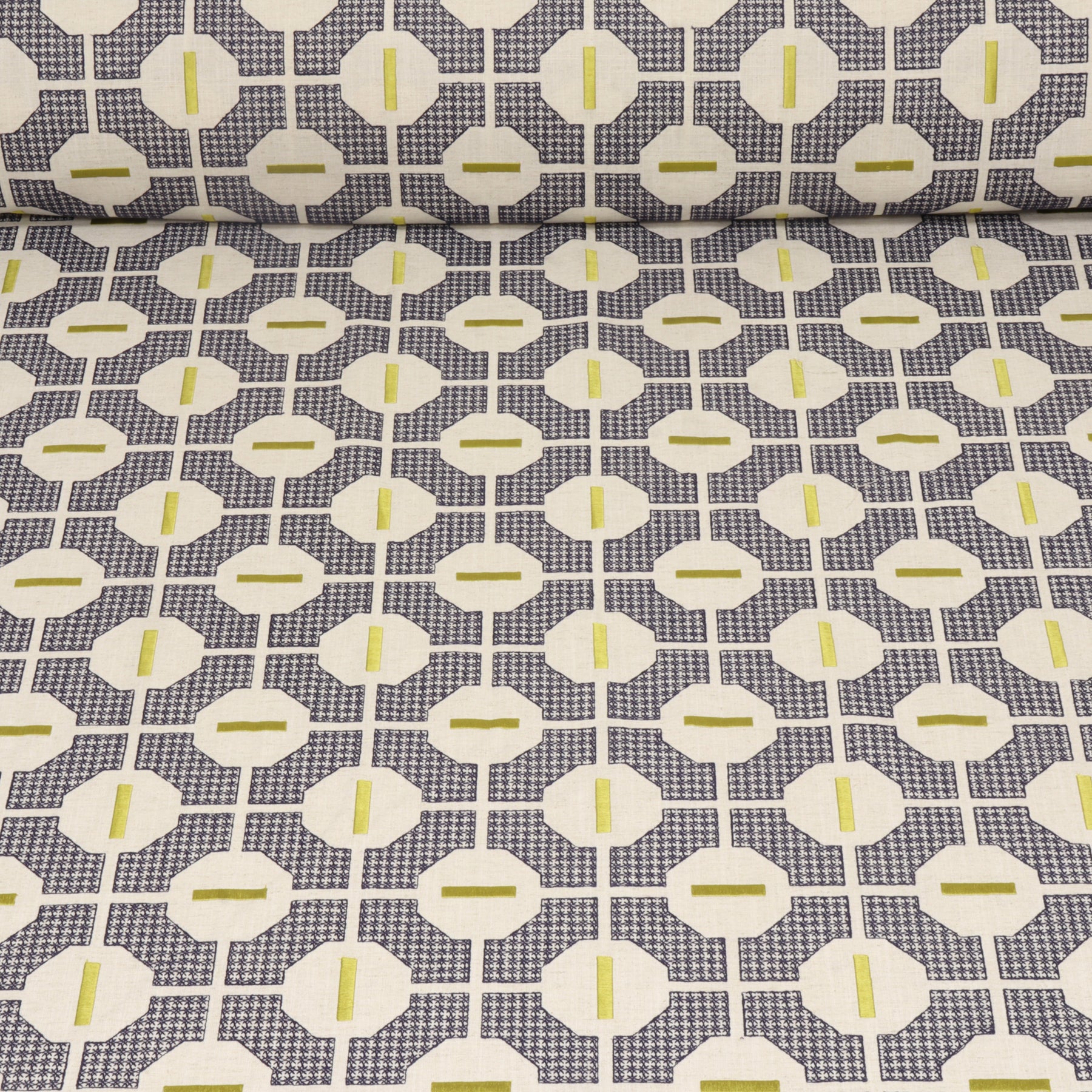 Rumba from Beaumont Textiles features a bold geometric pattern with interlocking shapes. The symmetrical pattern creates a visually engaging, modern look, blending traditional textile motifs with contemporary aesthetics.