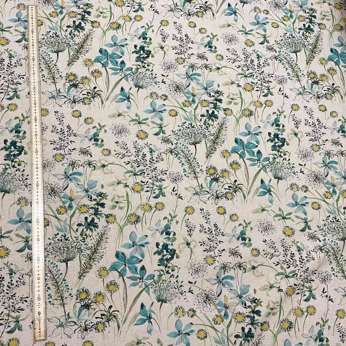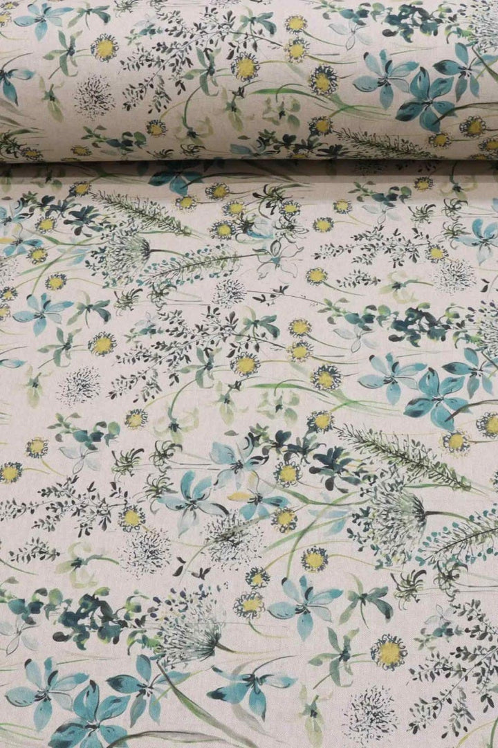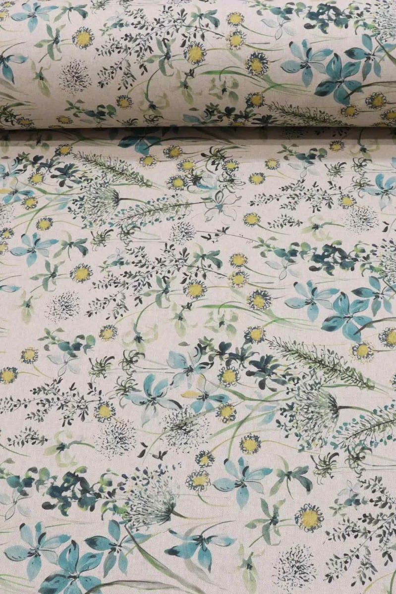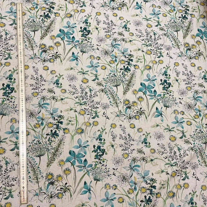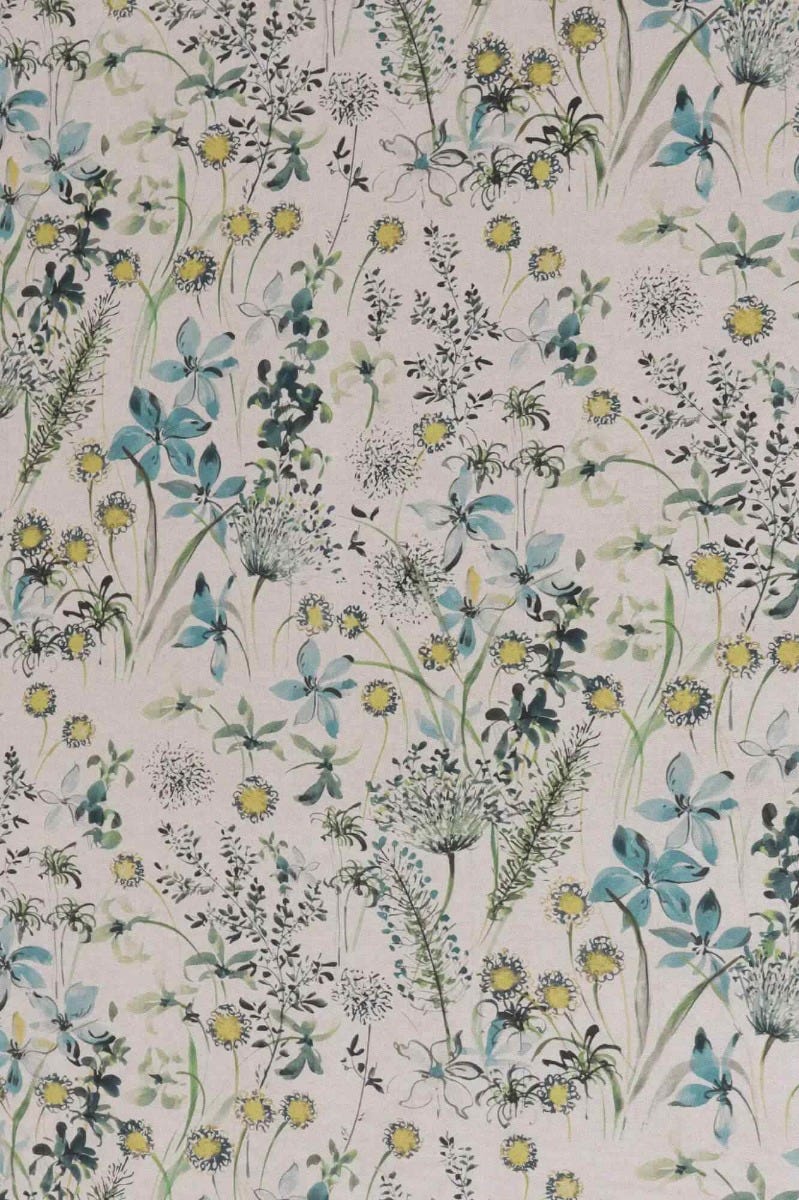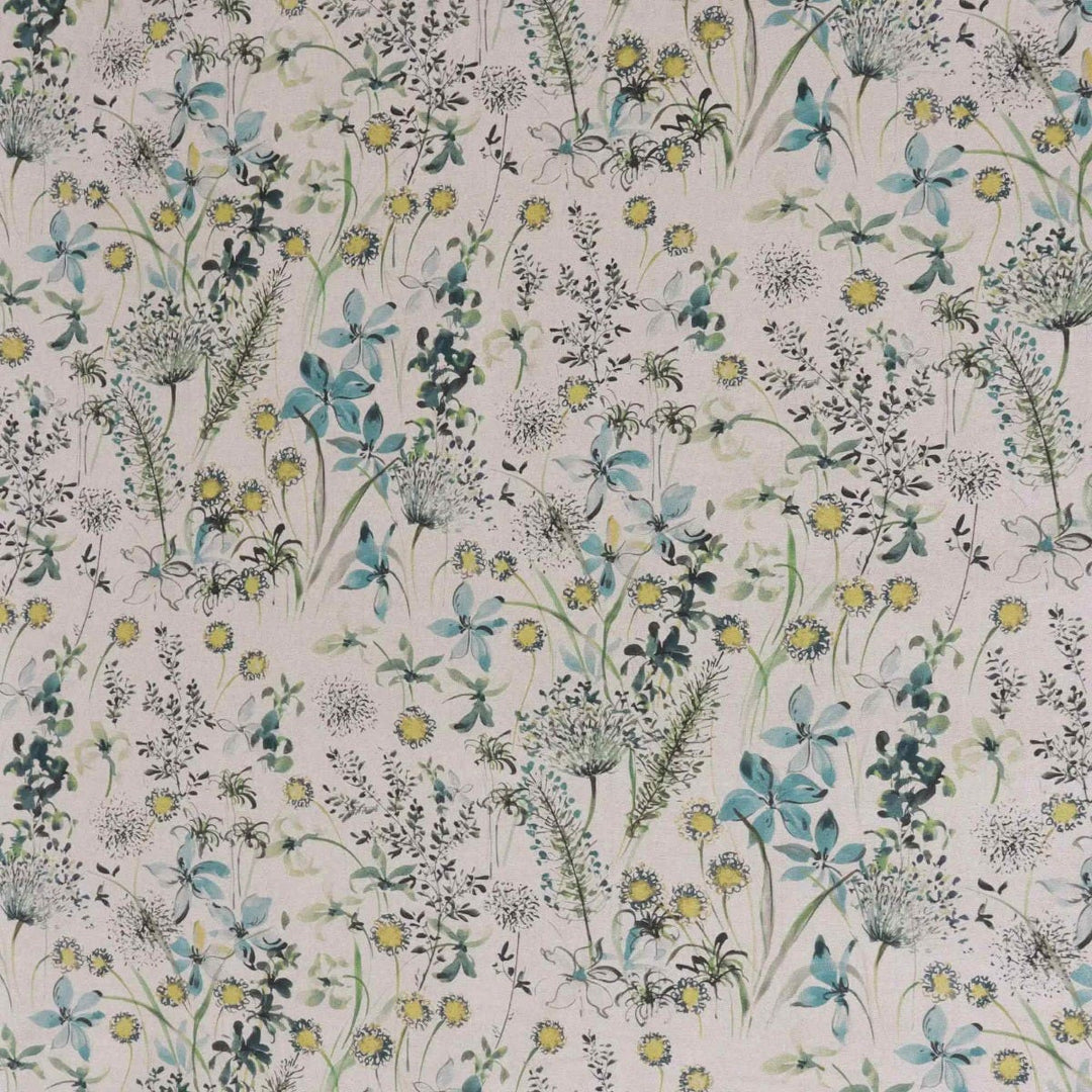 A lovely fabric featuring a wildflower meadow in bloom, available in a vibrant teal colourway, The Meadow fabric is suitable for curtains, cushions, accessories and upholstery.