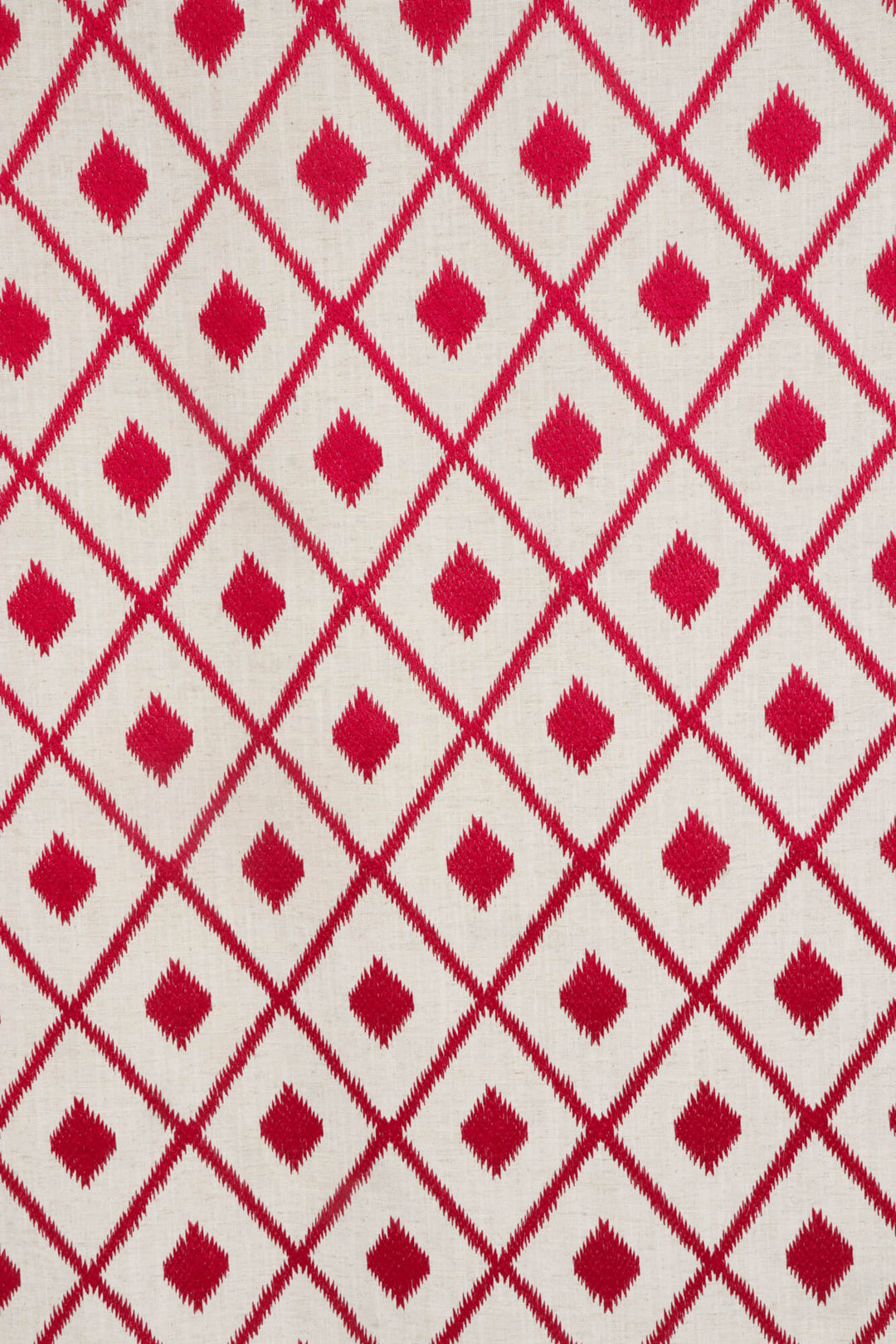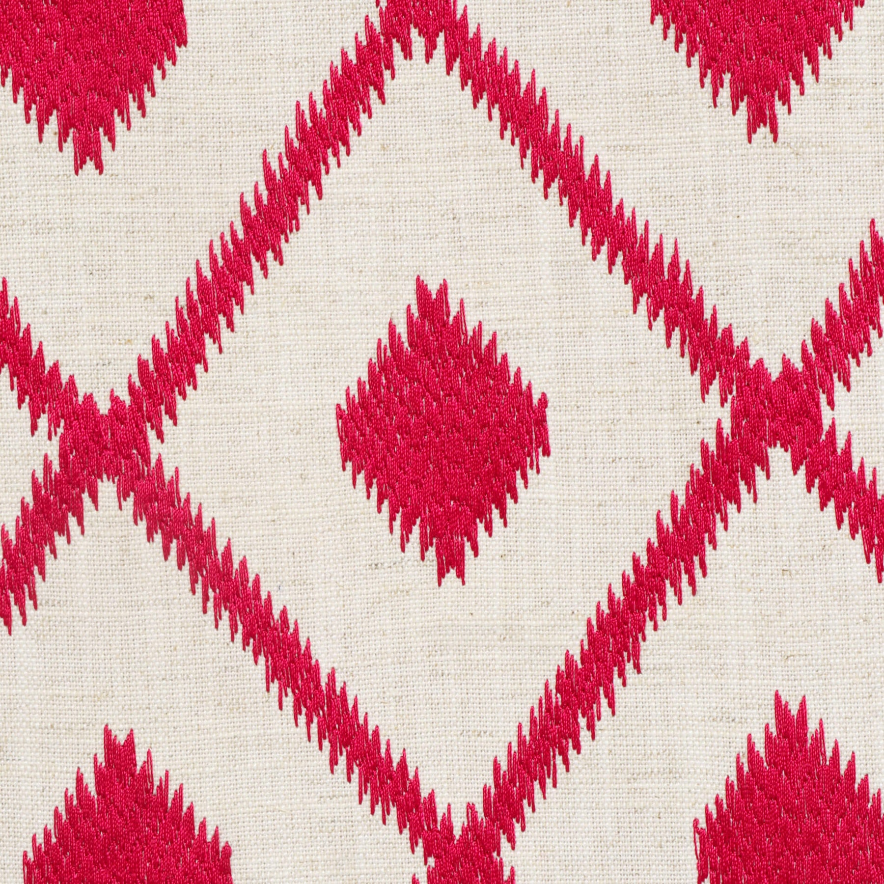 Thrill from Beaumont Textiles, showcases a striking pink and white diamond pattern. The off-white background enhances the boldness of the pink elements, creating a high-contrast, visually impactful embroidered design.
