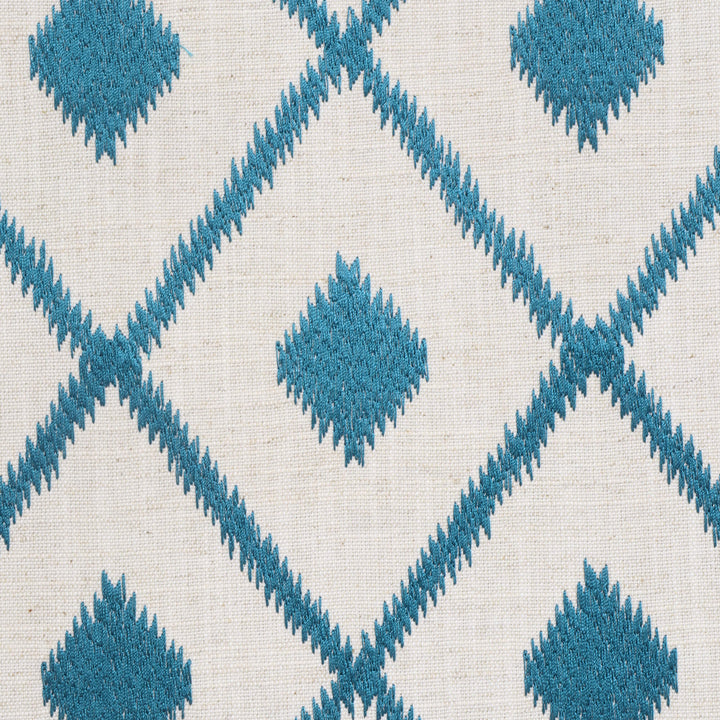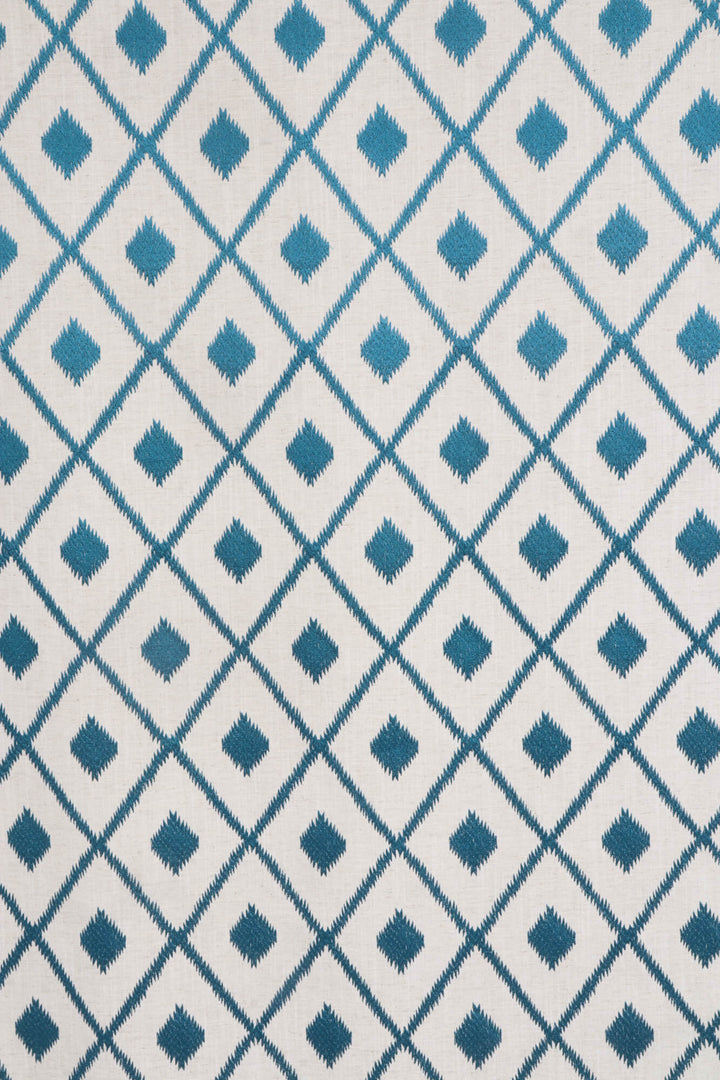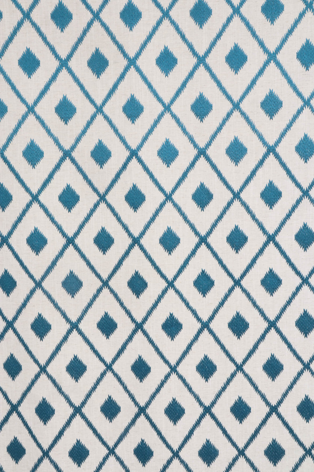 Thrill from Beaumont Textiles, showcases a striking teal and white diamond pattern. The off-white background enhances the boldness of the teal elements, creating a high-contrast, visually impactful embroidered design.