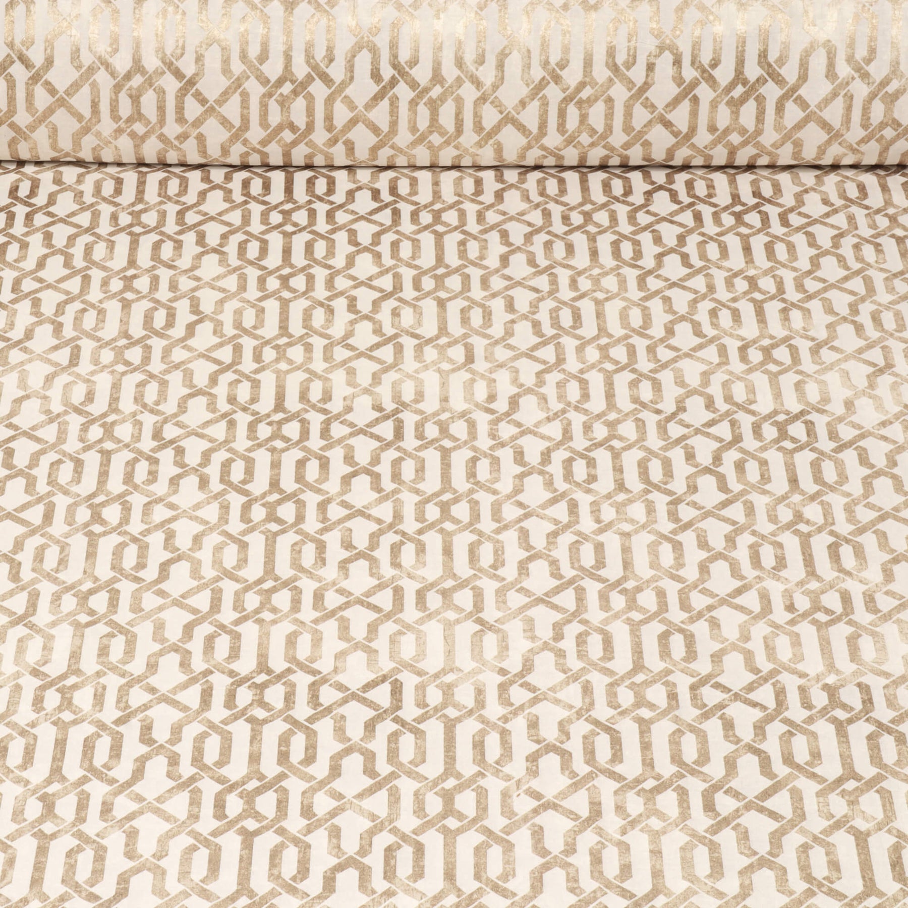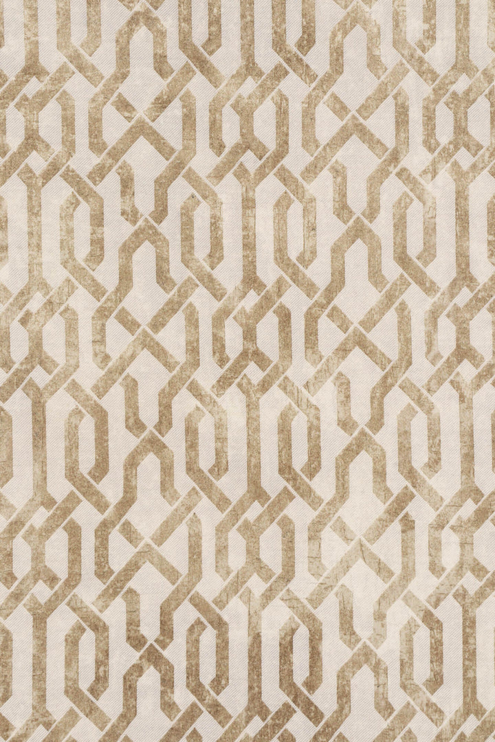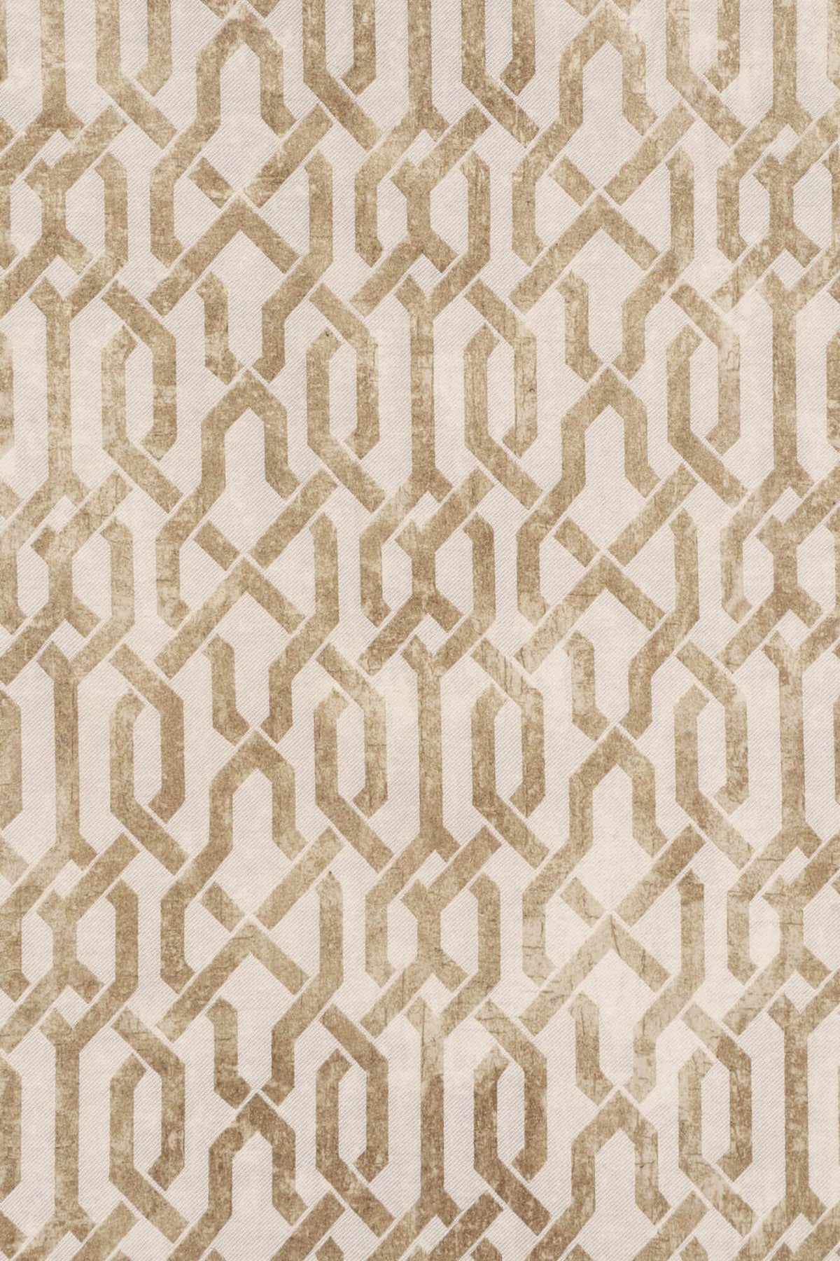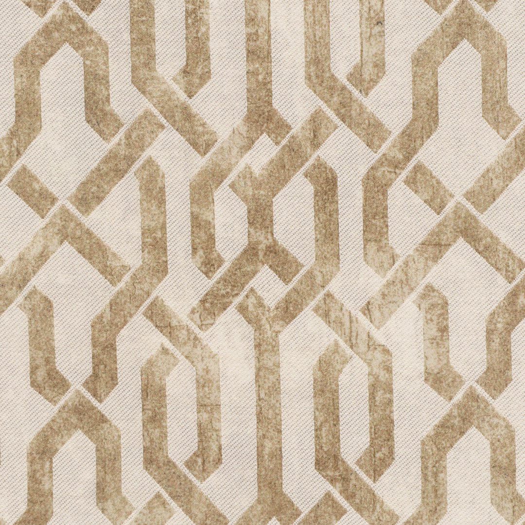 Trance Gold Fabric features an intricate geometric trellis pattern in shimmering gold on a soft neutral backdrop, this fabric exudes sophistication and style. Inspired by graceful natural curves and textures, the pattern exudes sophistication while maintaining a relaxed and calming aesthetic.