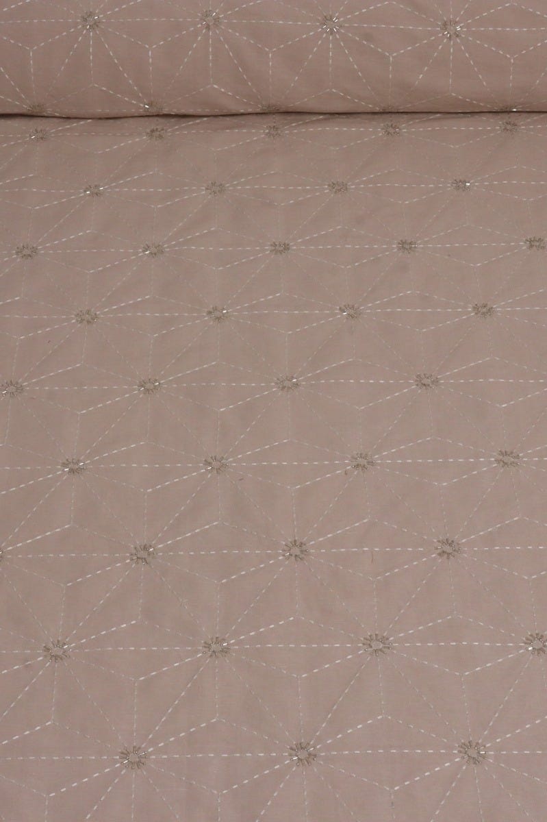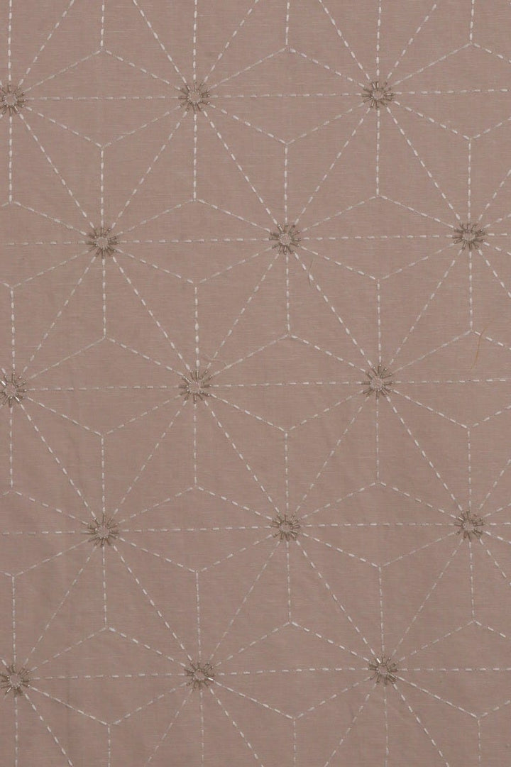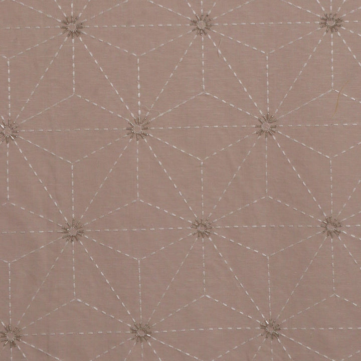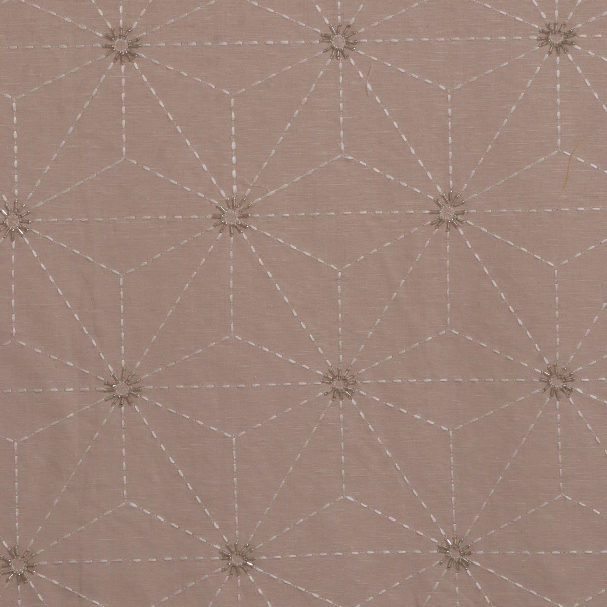 This contemporary Voyage fabric features a subtle contrasting embroidered geometric interlocking pattern on a champagne coloured cloth.
