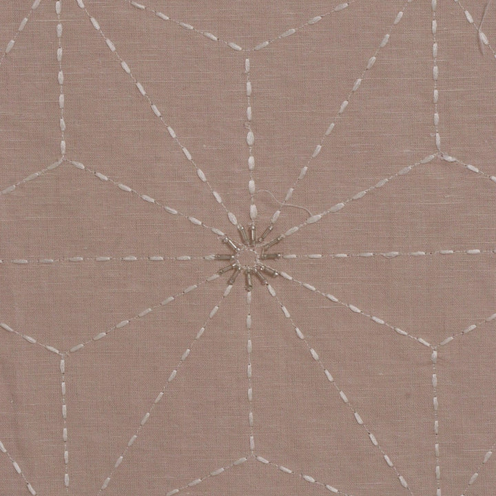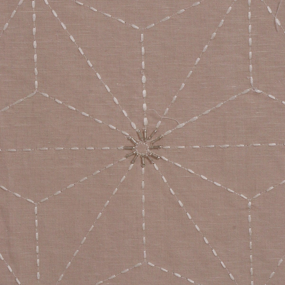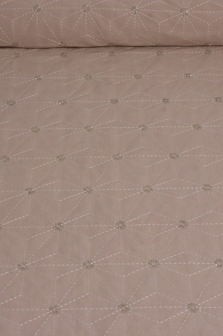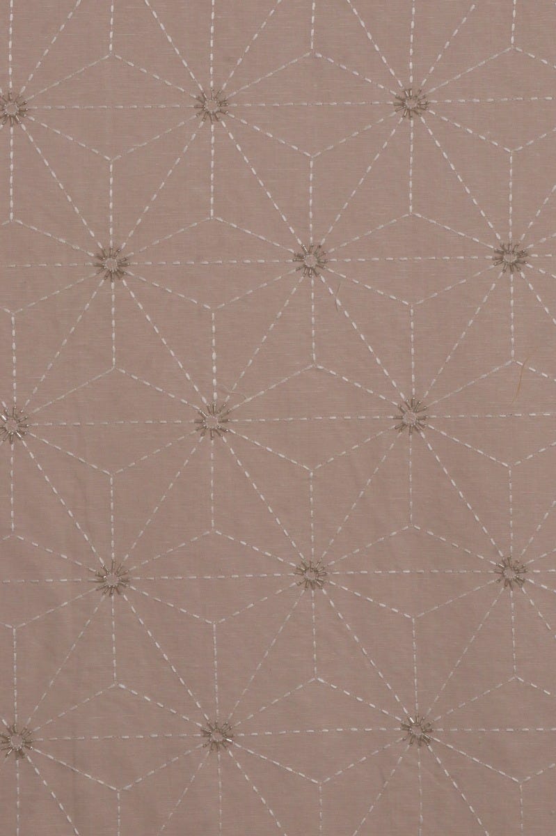 This contemporary Voyage fabric features a subtle contrasting embroidered geometric interlocking pattern on a champagne coloured cloth.