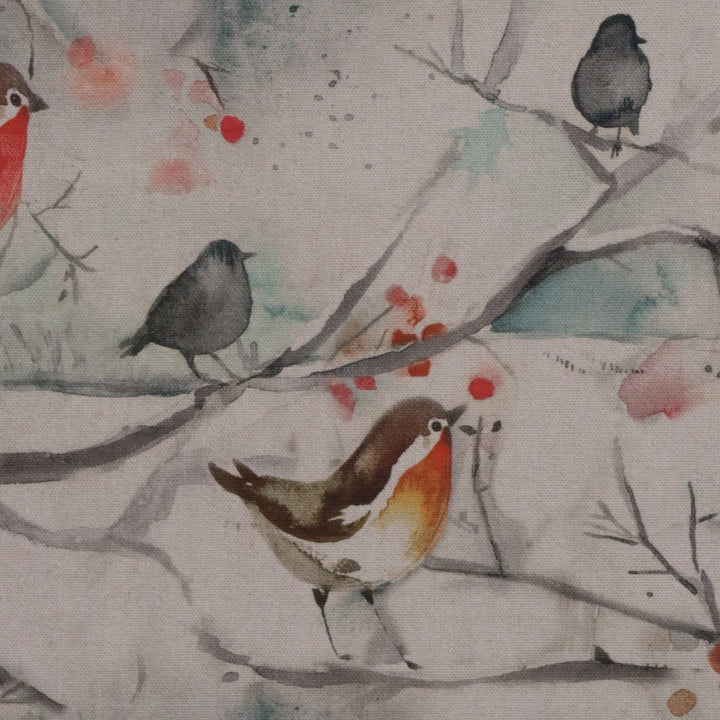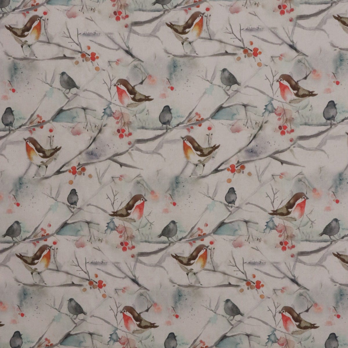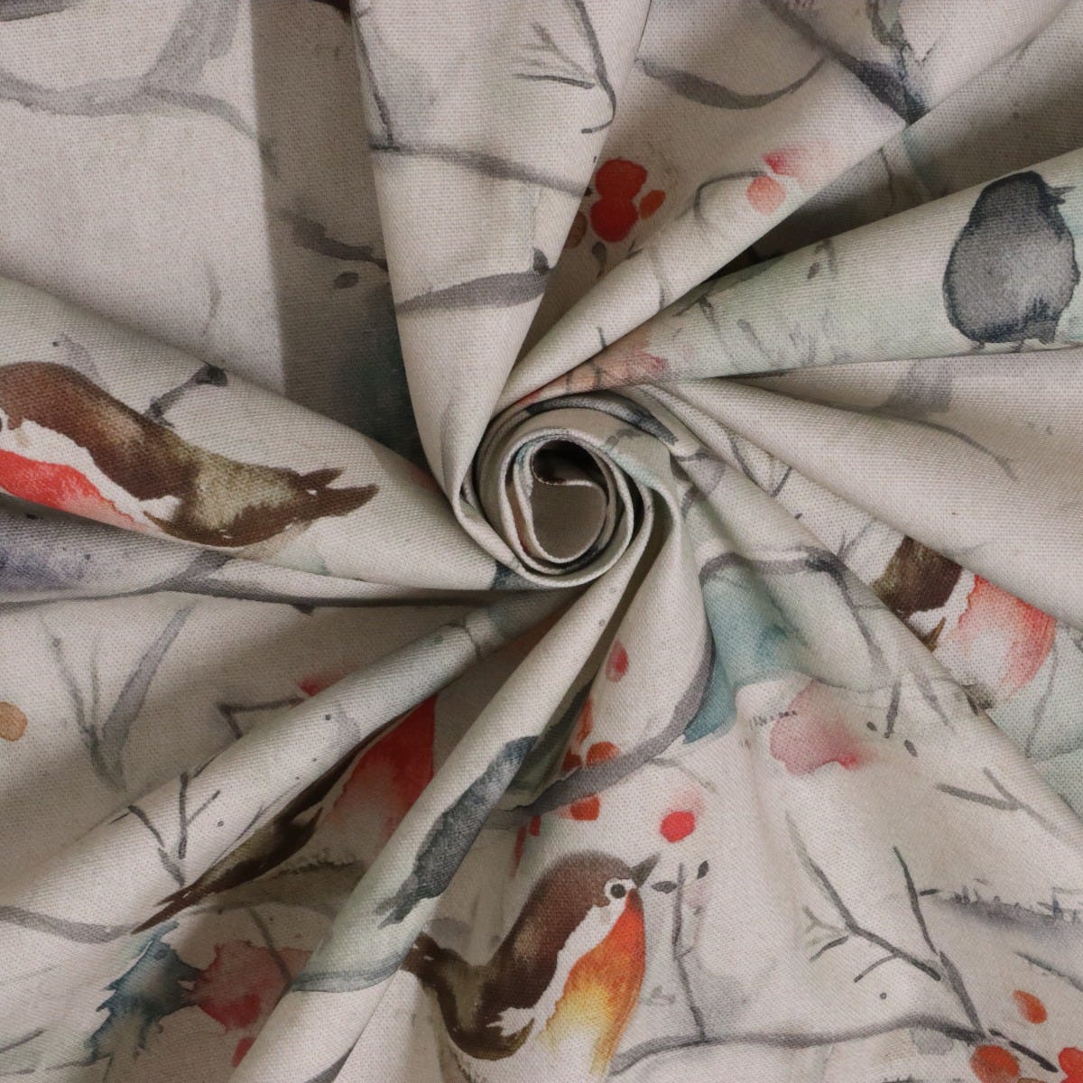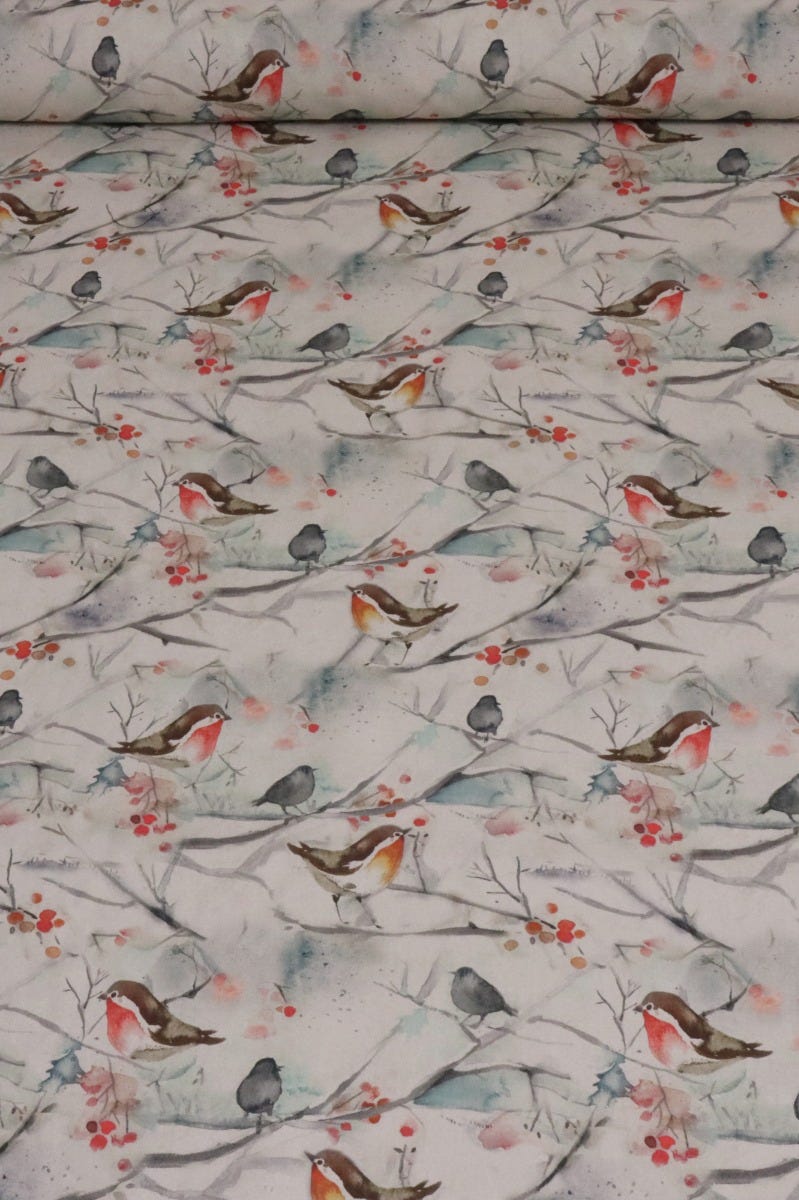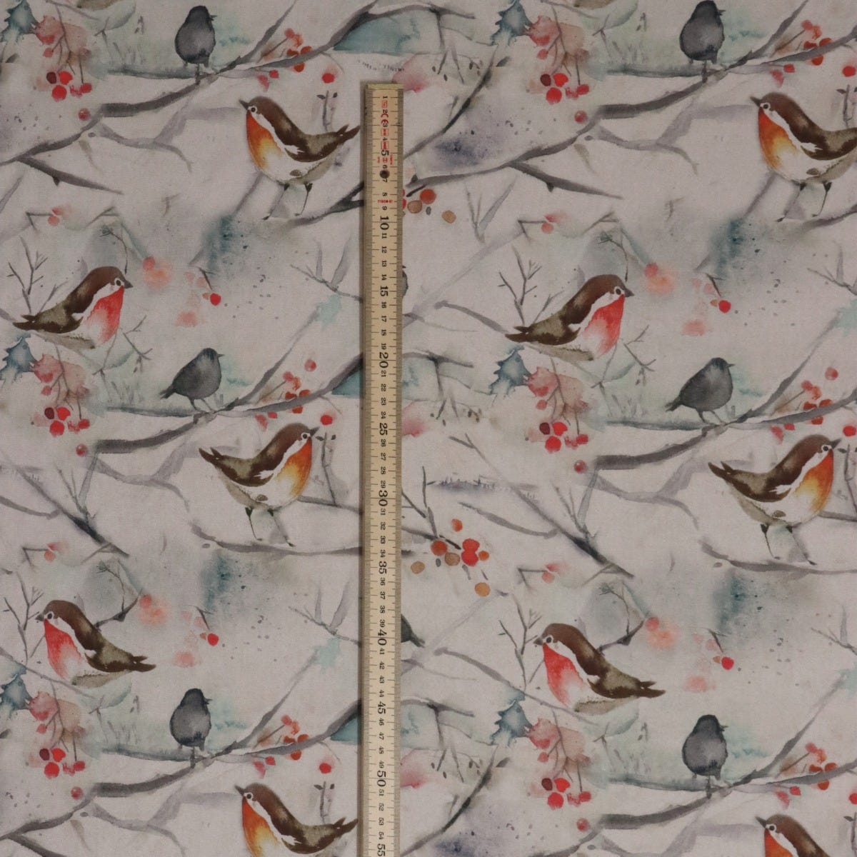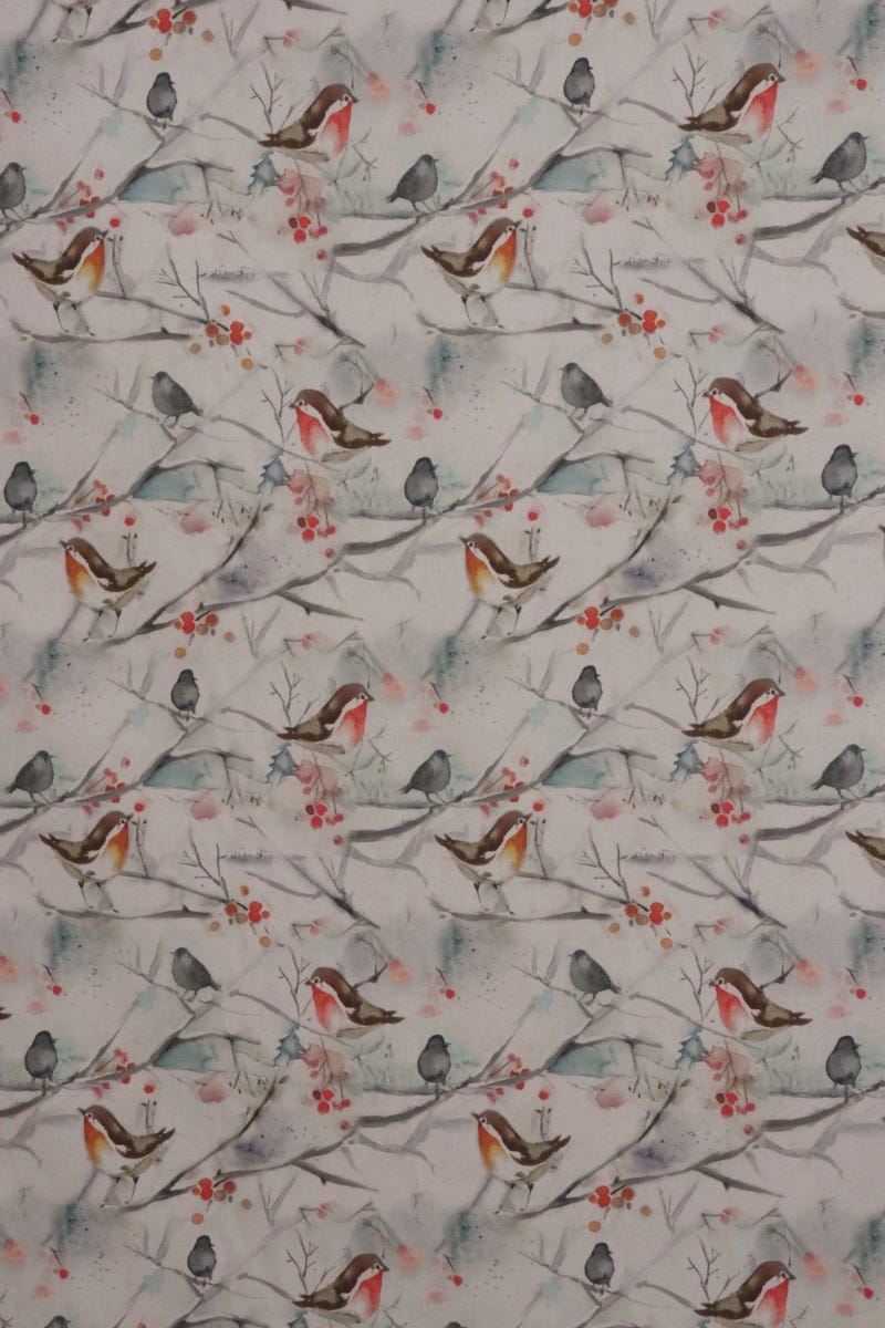 Inspired by snowy skies and frosty walks through the woodlands, this delightful design features cheerful robins signing in a frosty winter morning scene. A linen background colour printed on a cotton cloth.