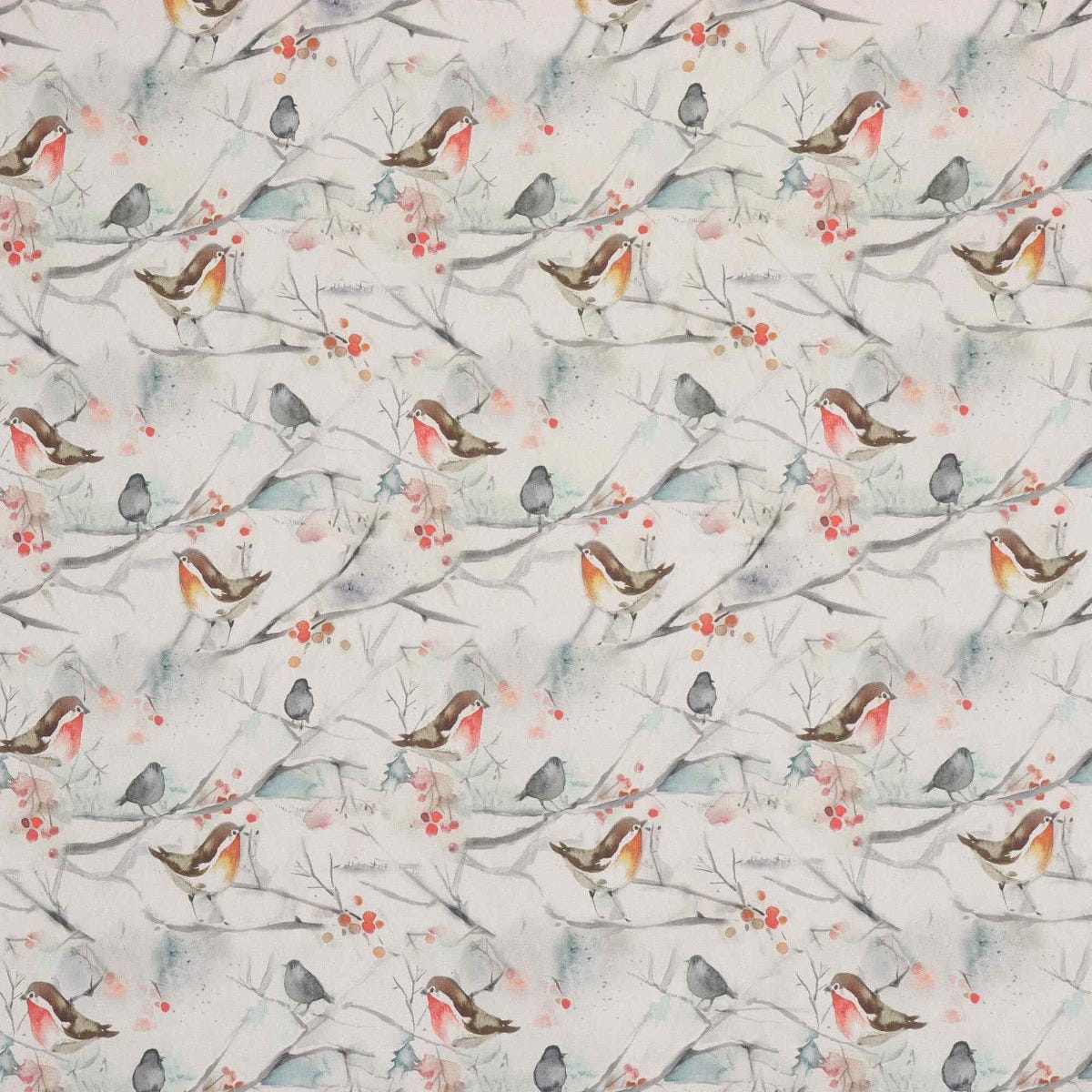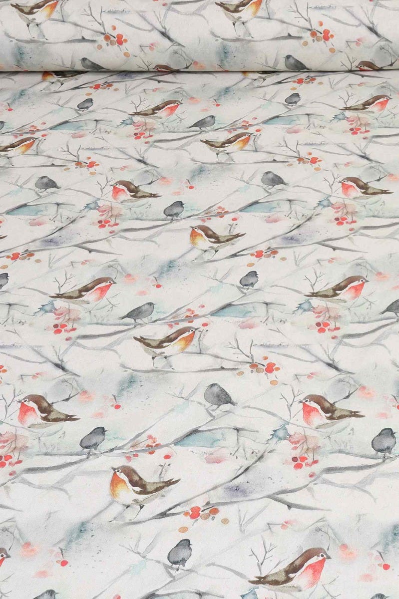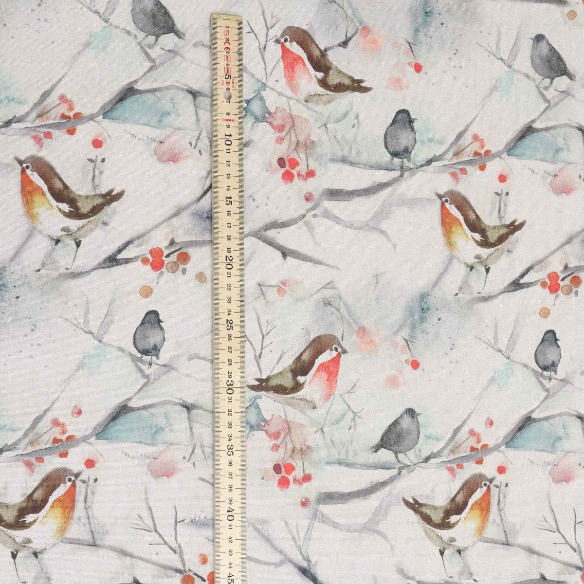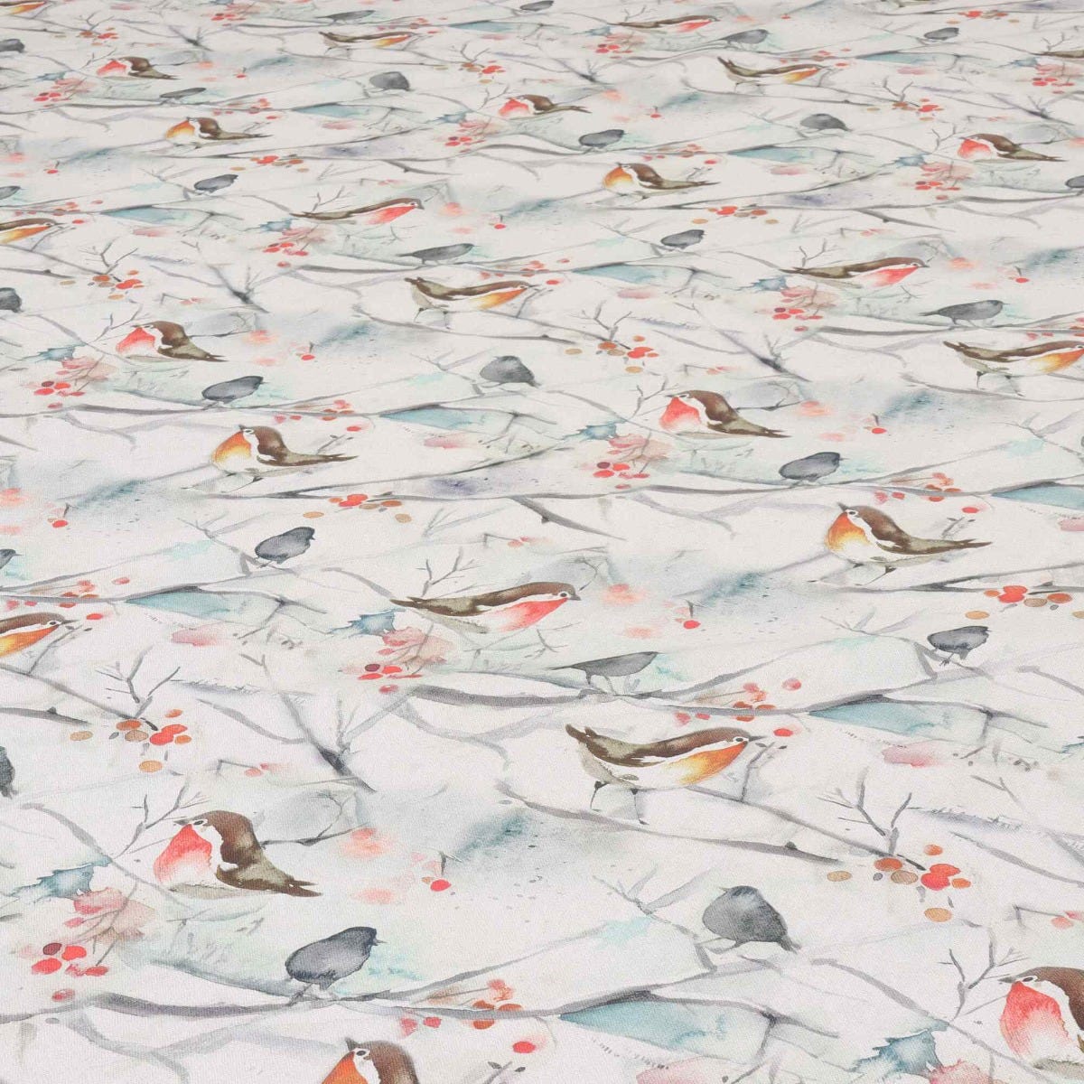 This winter inspired Voyage design features robins singing in a gorgeous white/ecru snowy scene. Printed on a luxurious 100% cotton fabric.