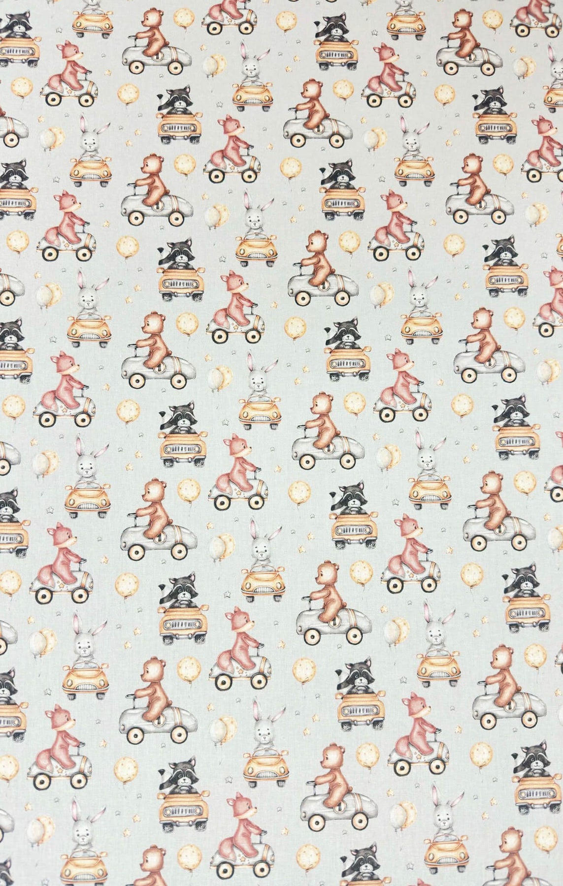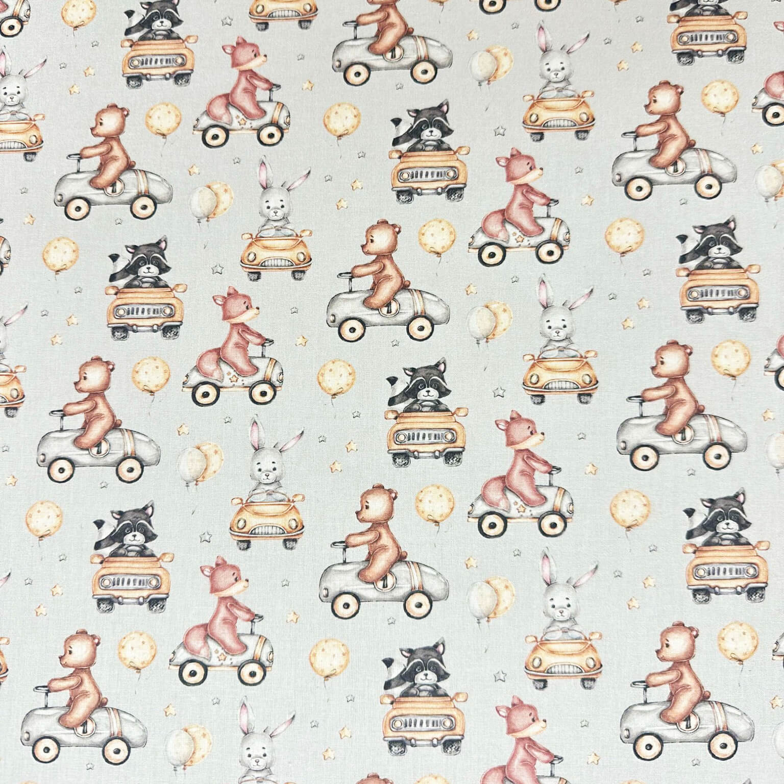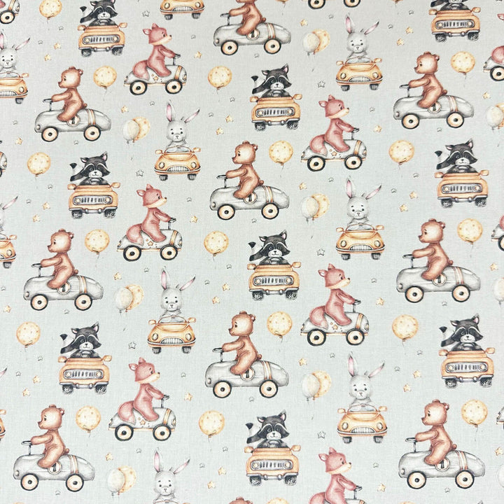 Woodland Racers fabric features an adorable, playful pattern of cute animals like bears, bunnies, and raccoons riding cars. Surrounding them are soft pastel-coloured balloons and stars, set against a light greyish tone background.