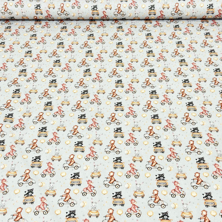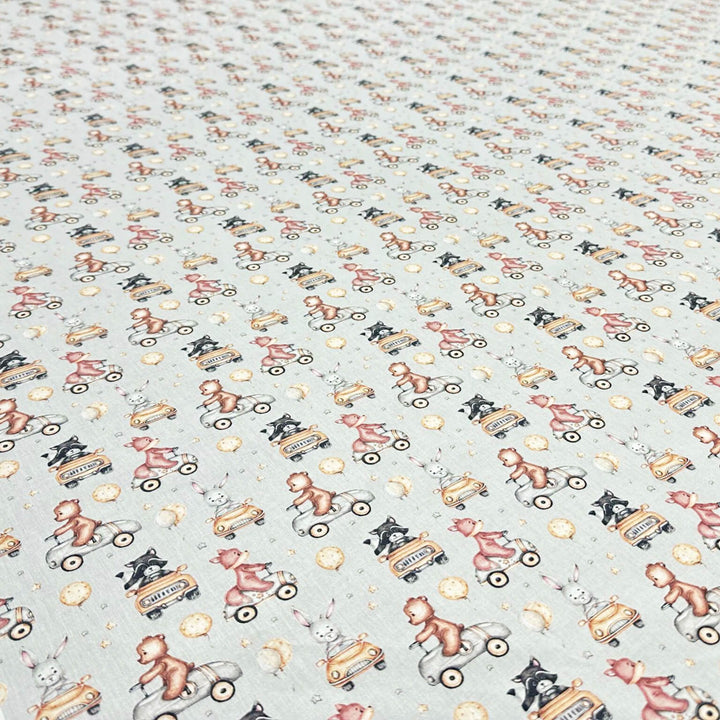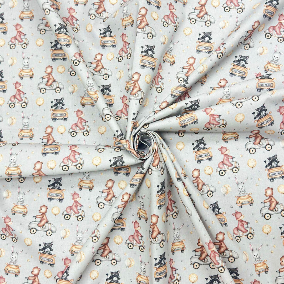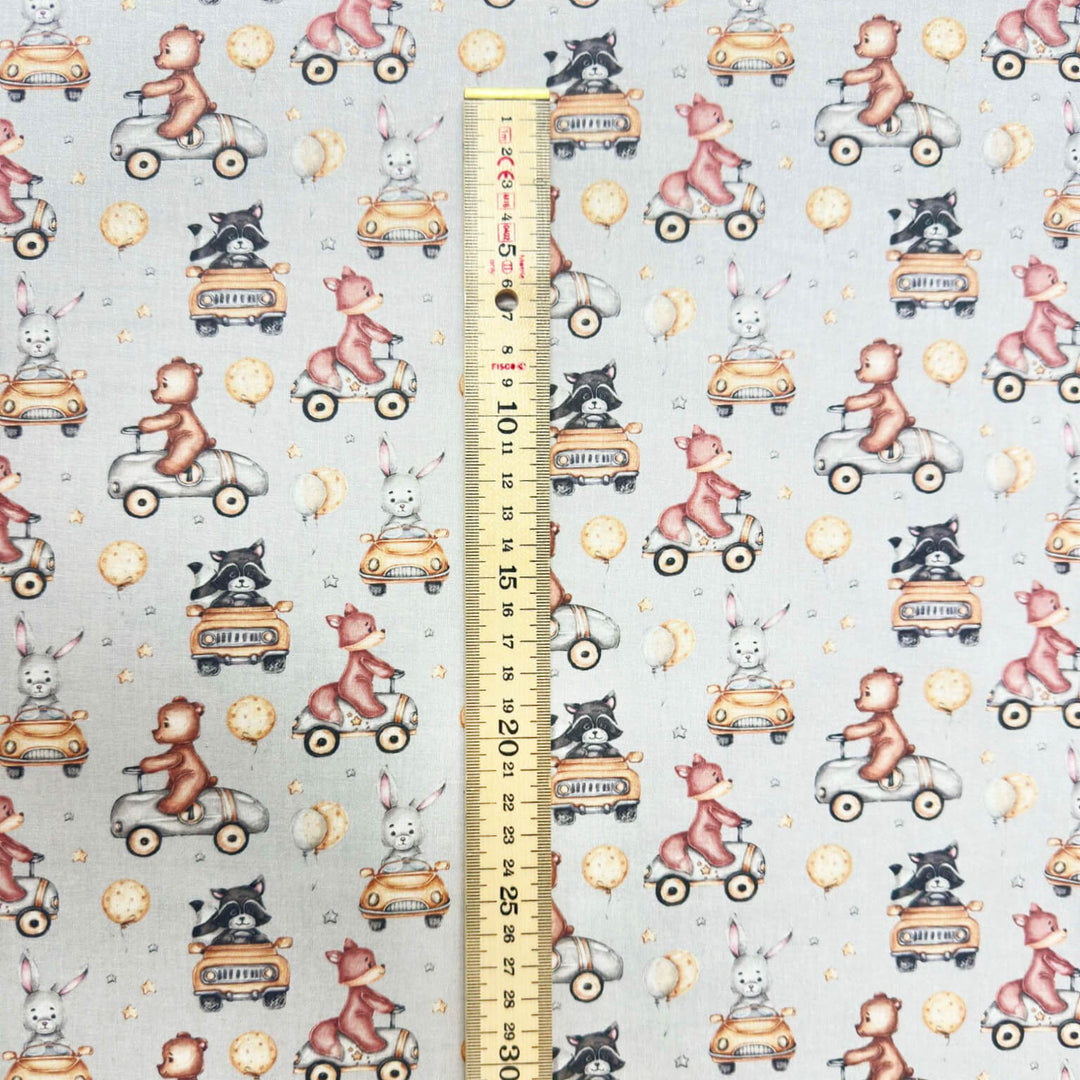 Woodland Racers fabric features an adorable, playful pattern of cute animals like bears, bunnies, and raccoons riding cars. Surrounding them are soft pastel-coloured balloons and stars, set against a light greyish tone background.